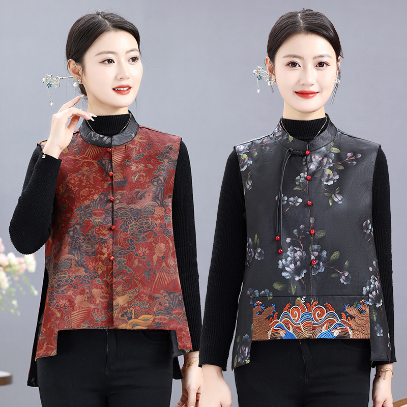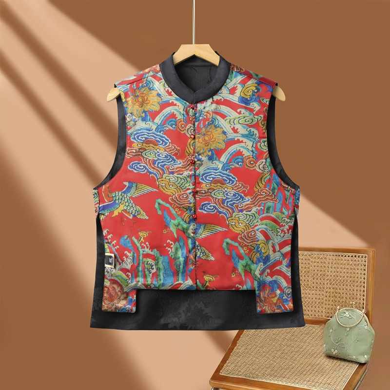 2025年春レトロ新中国風刺繍エスニックプリントリバーシブルファッショナブルなスタンドカラーショートベスト女性用
