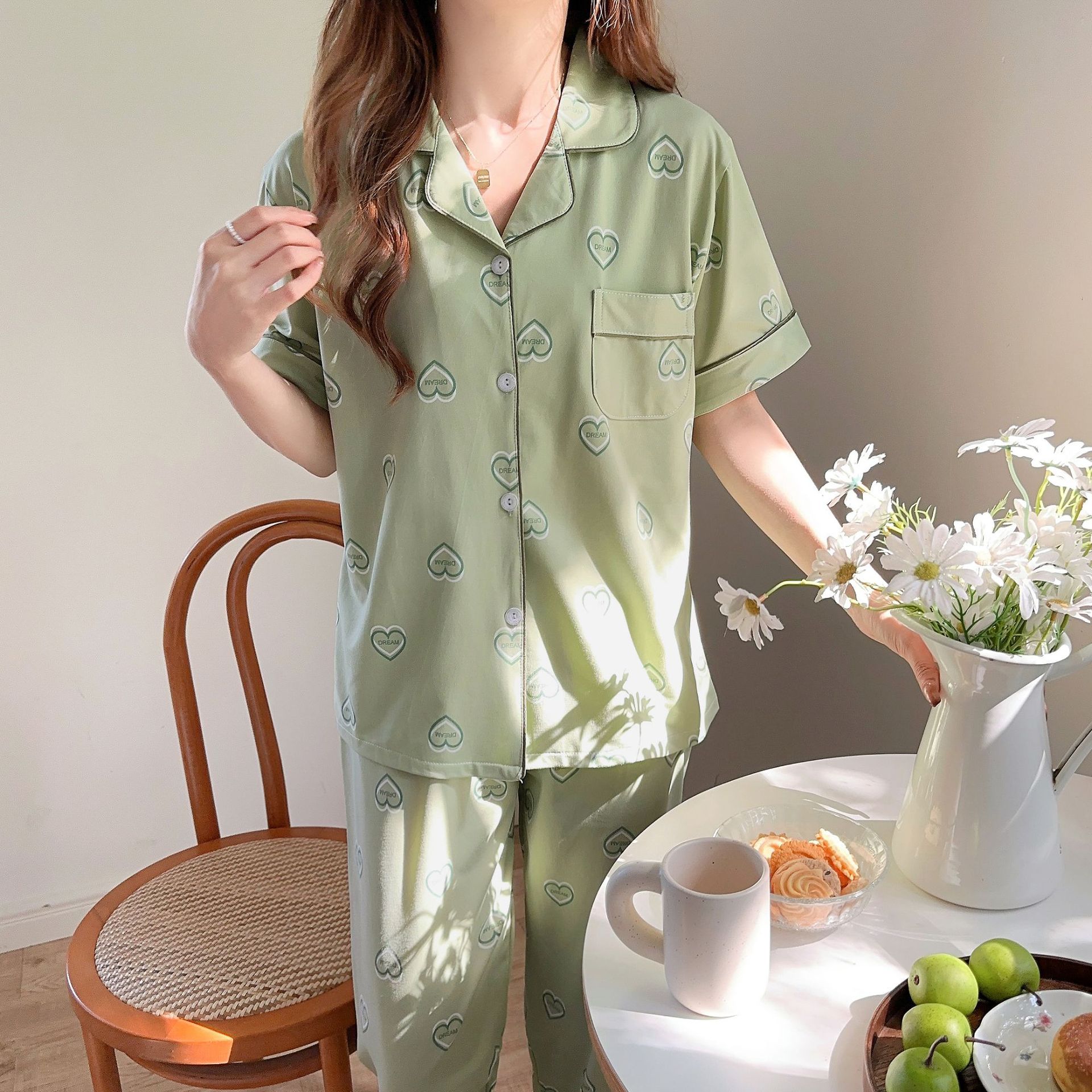 韓睡眠依2024以上のオプションの3セットins小清新パジャマ女性半袖ズボン家庭服は外着できる