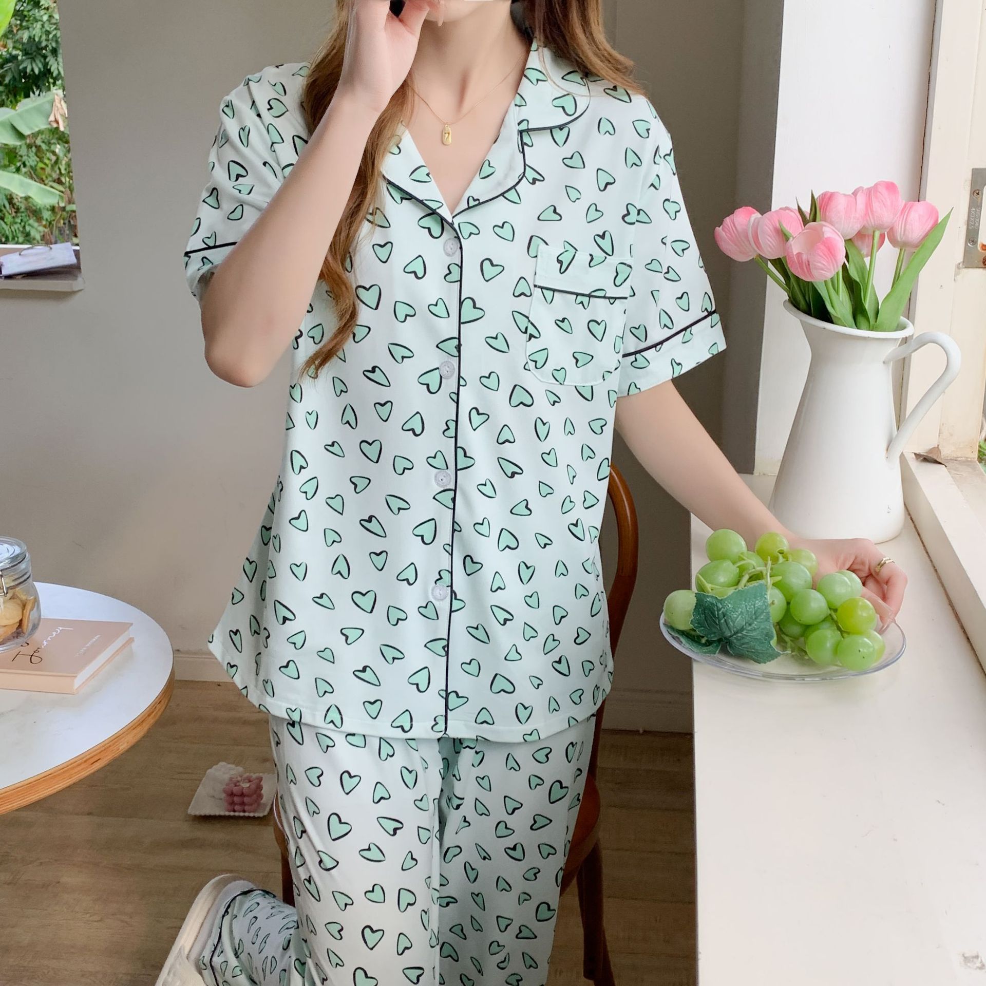 2024以上のオプションM-XXL微商振音爆金夏半袖長ズボンカーディガン韓国版家庭服カバー
