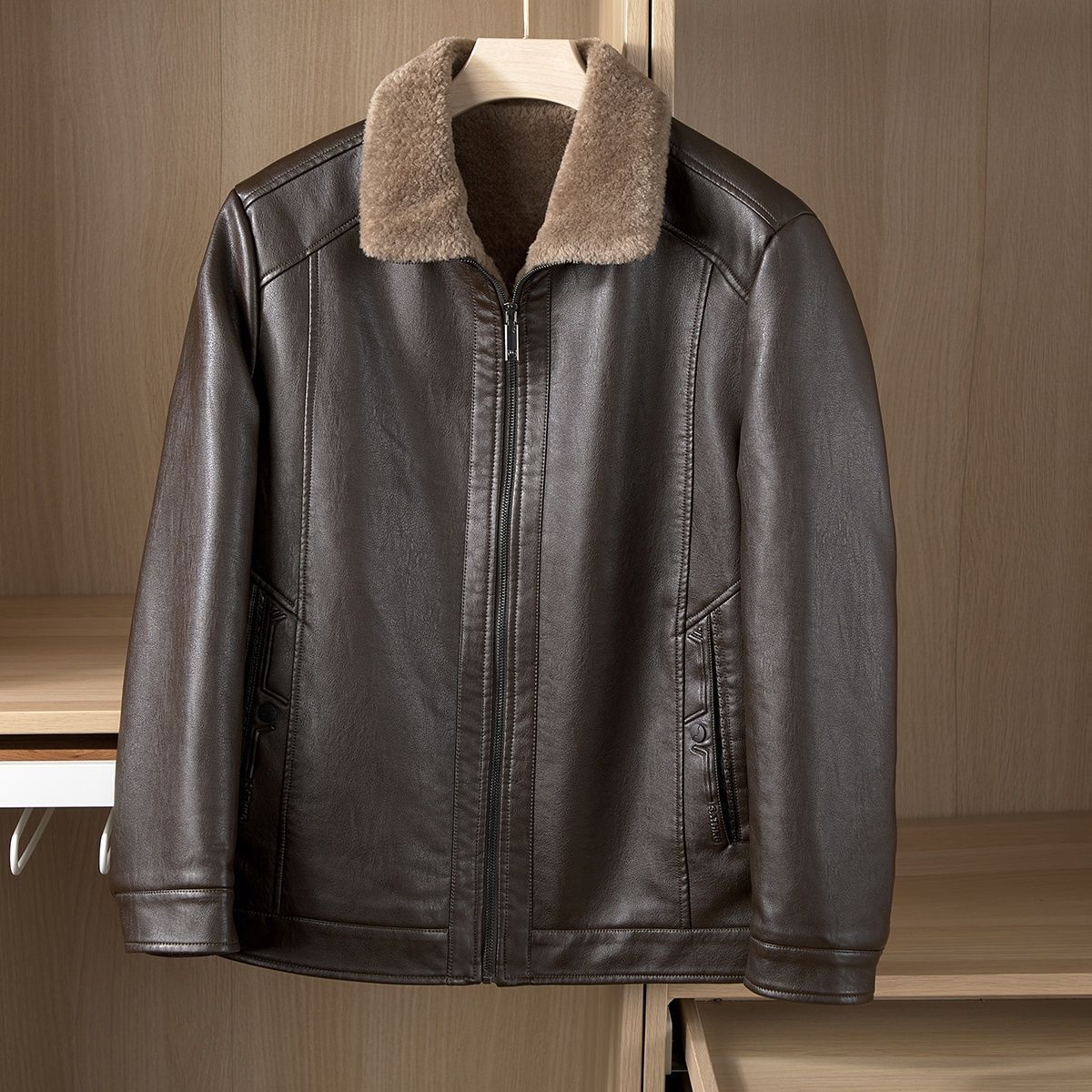 毛皮一体型ラムウール羊革柄冬用レザージャケット 厚手本革衣 海寧製裏起毛メンズアウターPU