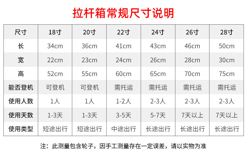 20寸适合用为工作出差,22寸适合短途的旅行,24寸与26寸适合一周的旅行或是冬季出行,