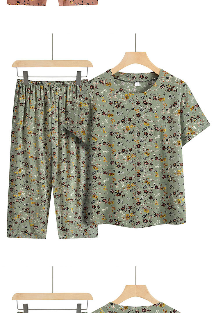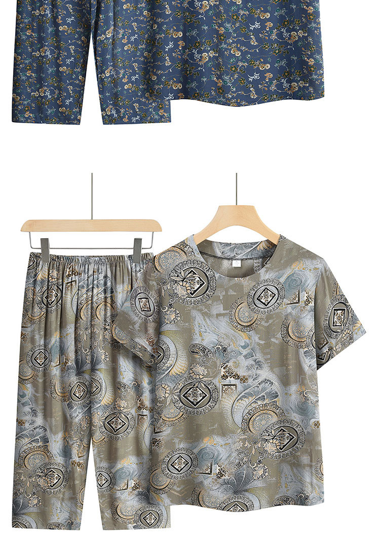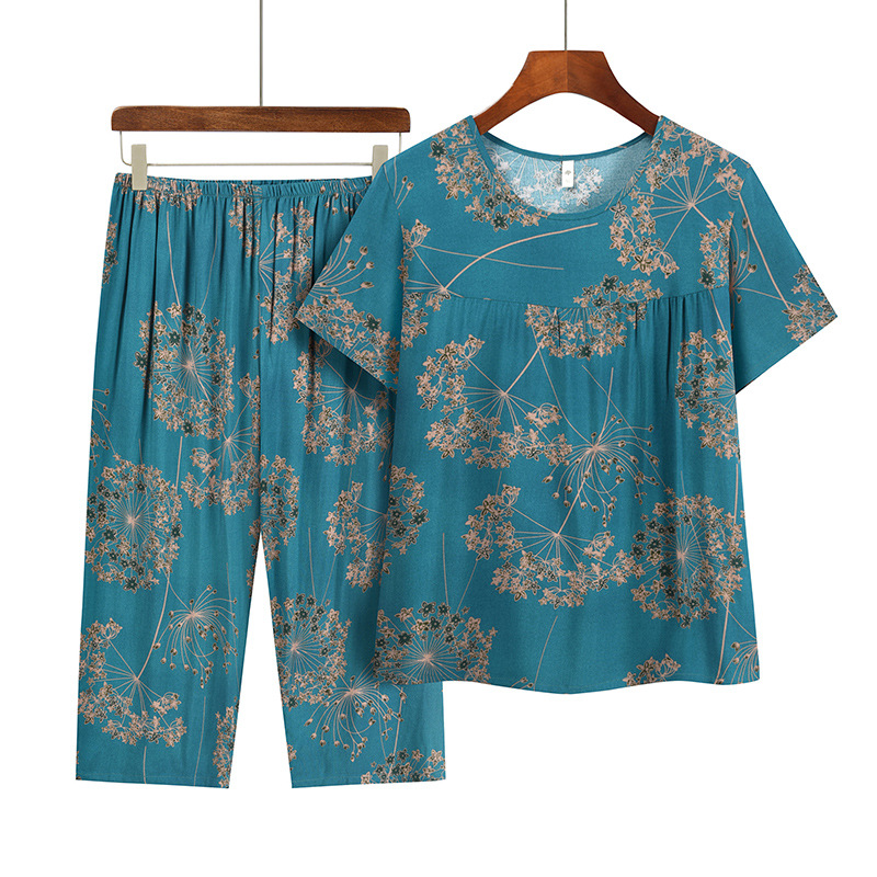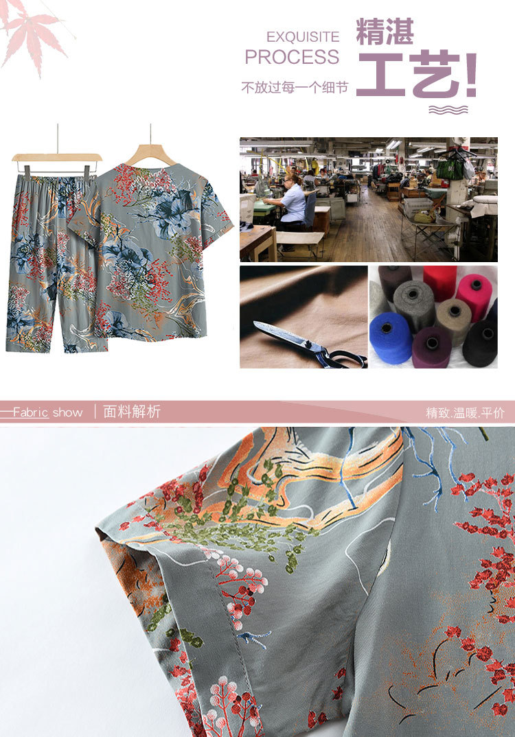 中高年ママ服パジャマ夏半袖通気性Tシャツセット春秋大きいサイズ綿麻プリントホームウェア