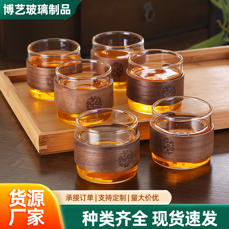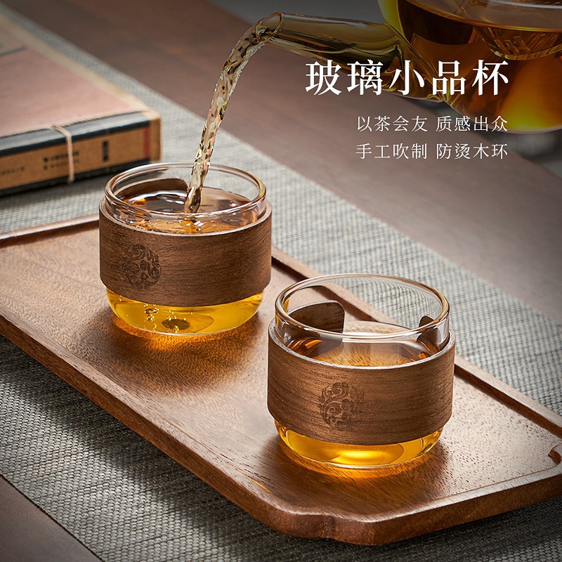 高硼硅玻璃小茶杯家用会客喝品杯烟灰玻璃品茗杯胡桃木环隔热茶杯