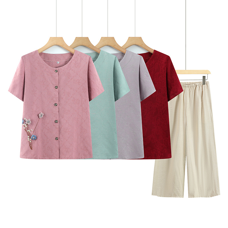中高年夏服女性2点セットママ夏スーツ高齢者新半袖上着おばあちゃんカジュアル服