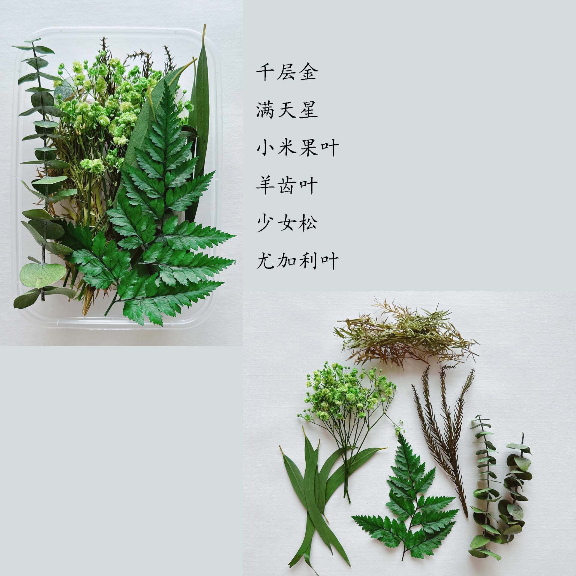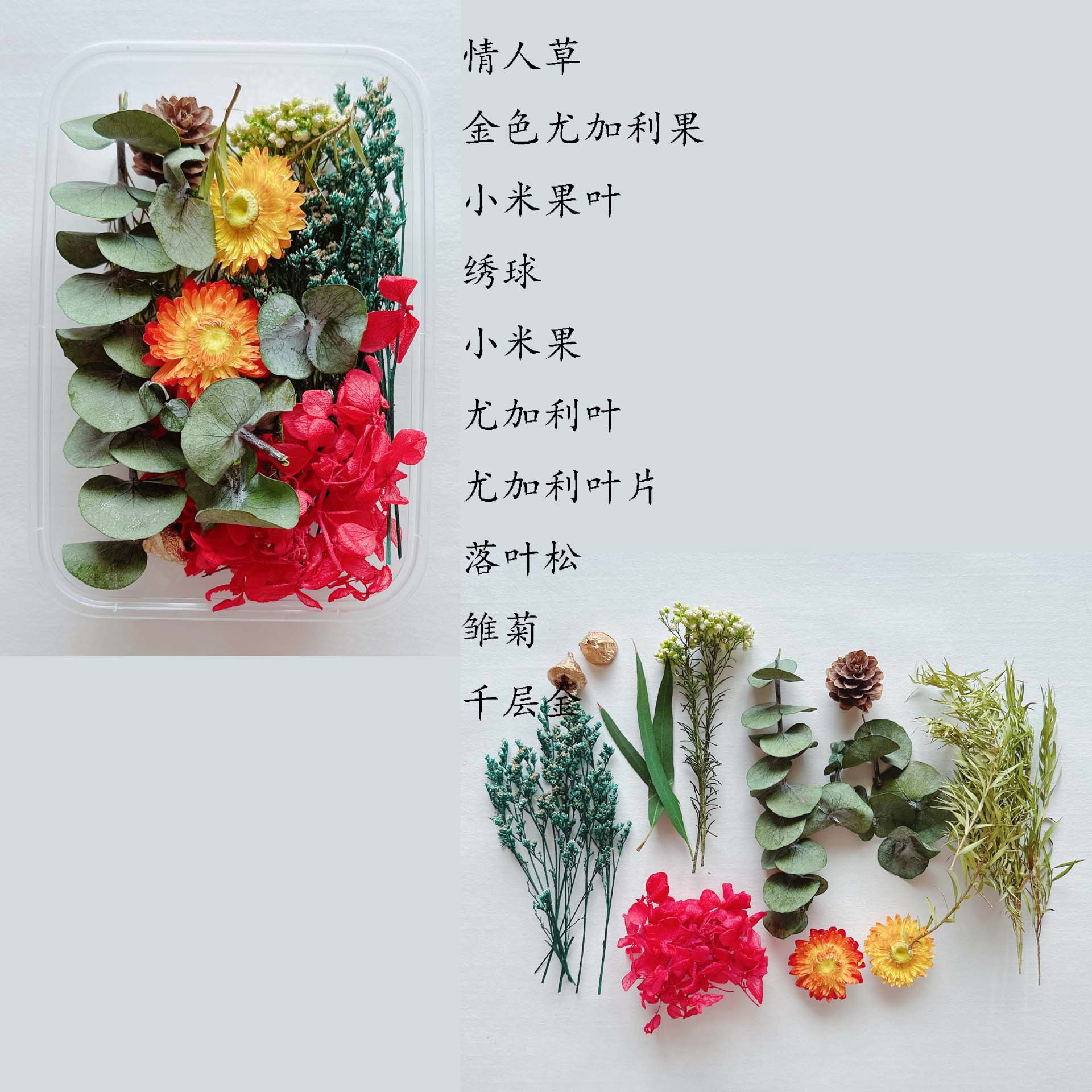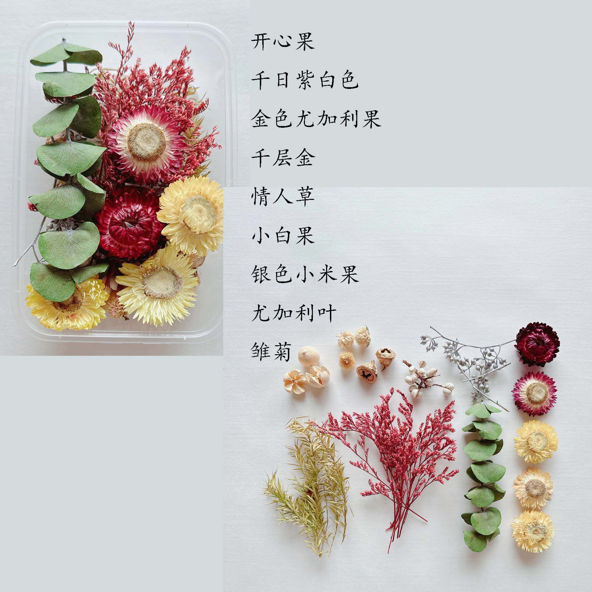 温馨提示:一盒材料包由8-10种花材组成,花材不少于8种,不同季节,不同批次,花材不一样。