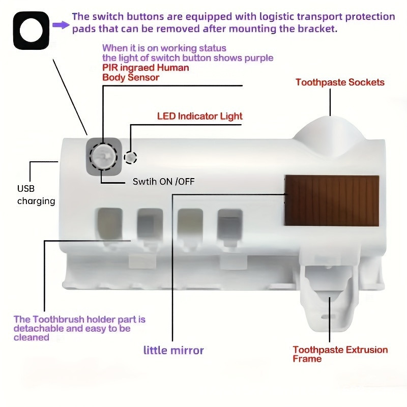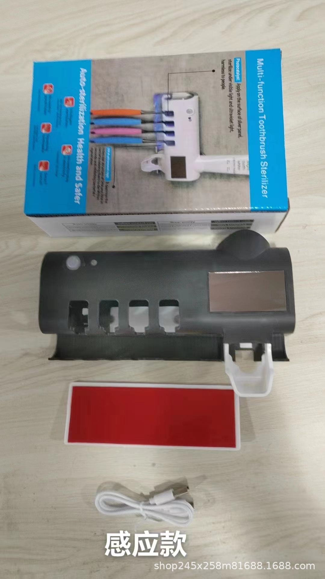 产品特点:智能双重杀菌 紫外线+光触媒牙刷消毒器是一款清洁和保护您家庭口腔洁具的智能多功能牙刷架。 在您不使用牙刷时,为家庭牙刷进行杀菌消毒。 红外智能感应系统使它在人靠近时激活,人离开后杀菌。 使之成为安全高科技智能牙刷架。此款牙刷消毒器拥有太阳能充电系统,无需阳光直射,见光即可充电。 锂电储能,节能环保,彻底摆脱插座束缚。 无需外部电源,让浴室环境变得美观大方。