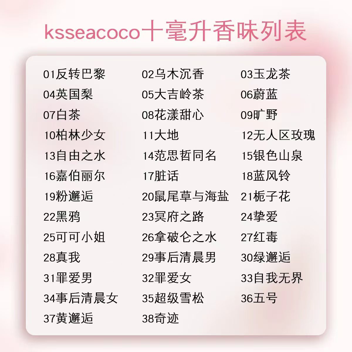 色の分類 ノーマンズランドのバラ,ピンクの出会い,無料の水,赤い愛,リバーサルパリ,MISS SWEETHEART,ZENMOO,ミス・ココ,銀の泉,アズール,MINING LAND,その後の早朝の男,クチナシ,YULONG TEA,青い風鈴,イングリッシュペアー,セージと海塩,ダージリンティー,白茶,冥府への道,赤い毒,ウード沈香,ナポレオンの水,同じ名前,黒アヘン,ベルリンの女の子,汚い言葉,Gabrielle,DADI,その後の早朝の女性,緑の出会い,スーパーシダー,MY WAY,罪深い愛する男,罪深い愛する女の子,FIVE,Huang Encounter,MIRACLE