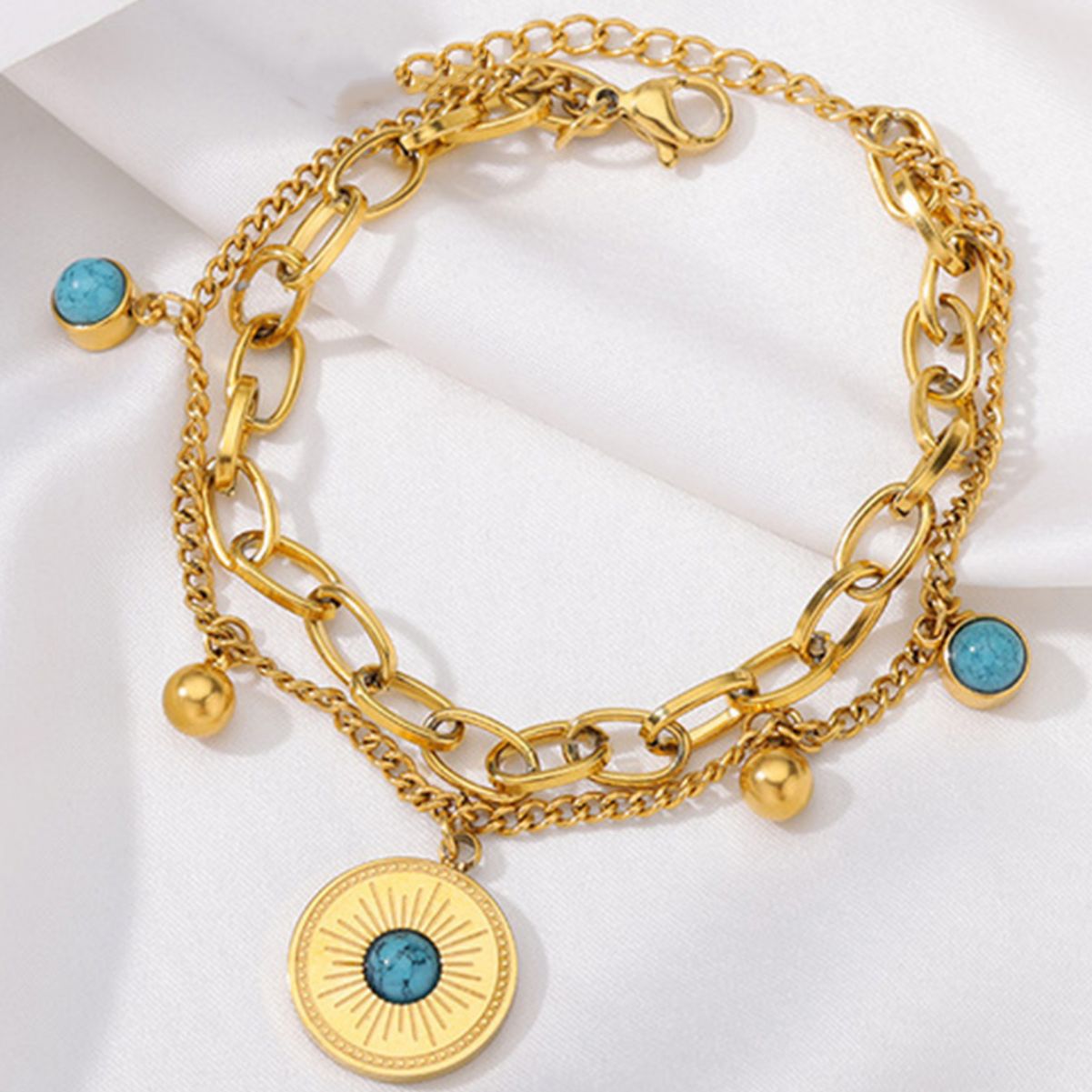 欧米のレトロなクロスボーダーの個性の小さい大衆のシンプルで高級感の二層のレトロな金色のチタンの鋼の丸いブランドの青い松石のブレスレット