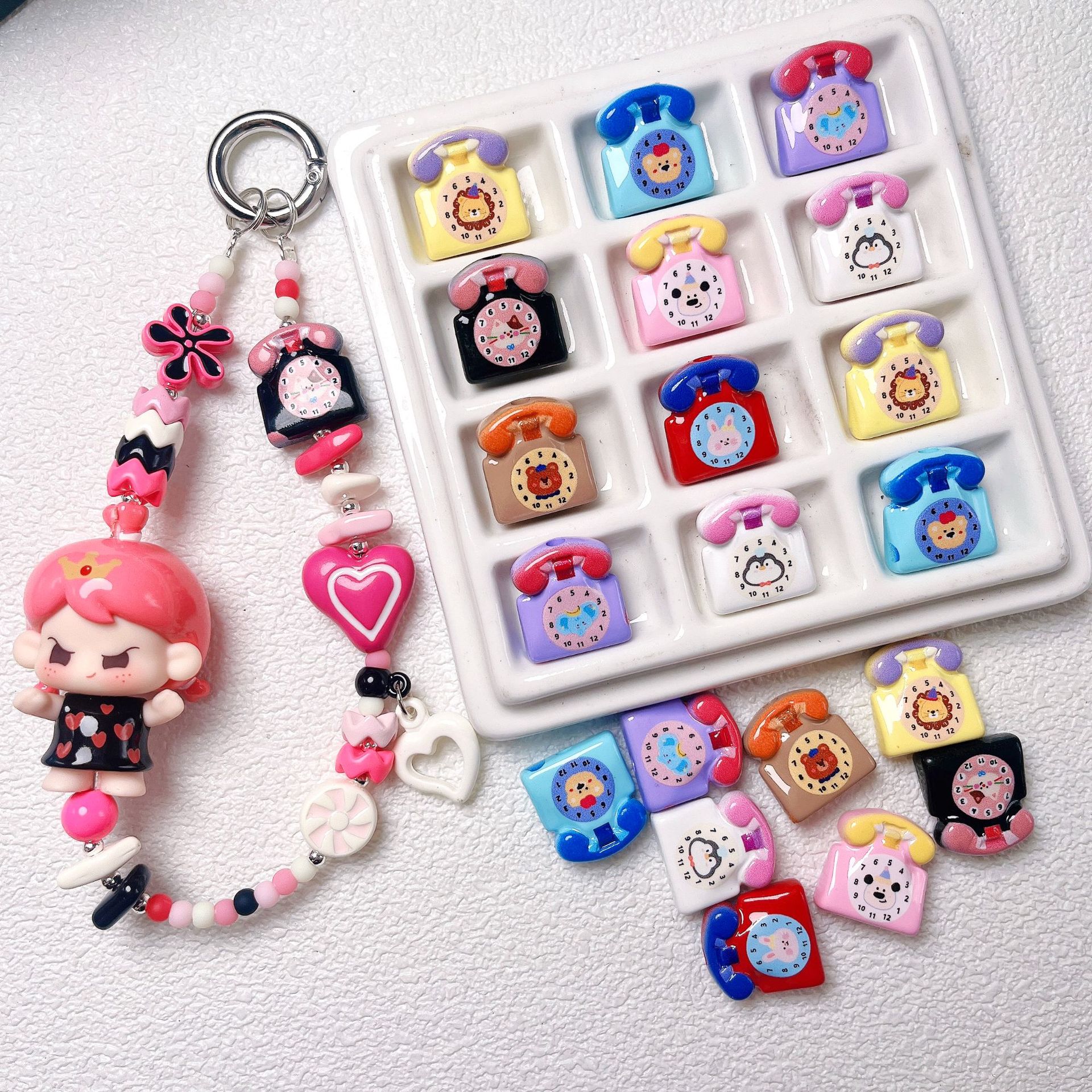 亚克力卡通双面印花可爱电话机直孔散珠 DIY手机链饰品串珠配件