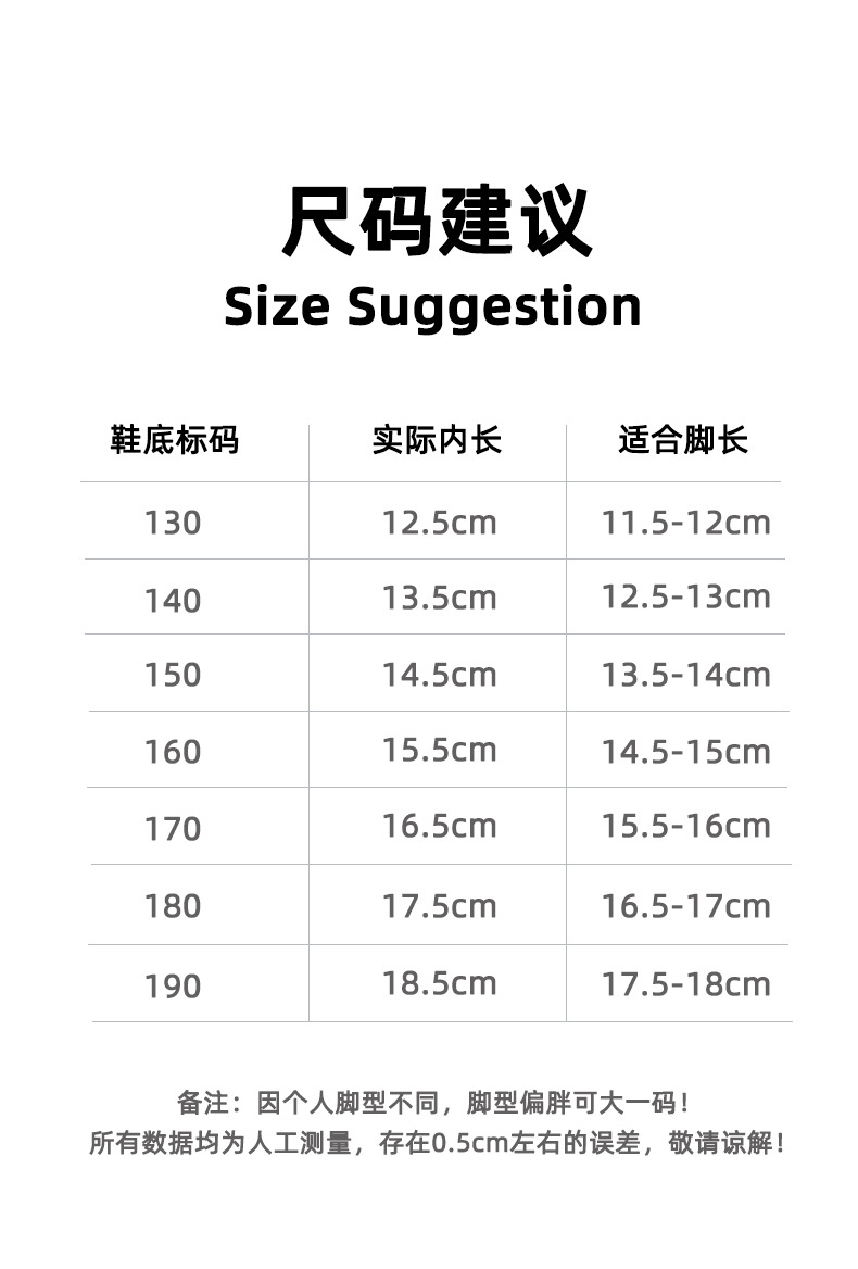 サイズ130で内寸長さ12.5cm,サイズ140で内寸長さ13.5cm,サイズ150で長さ14.5cm,サイズ160で内寸長さ15.5cm,サイズ170で内寸長さ16.5cm,サイズ180で内寸長さ17.5cm,サイズ190で内寸長さ18.5cm,サイズ200で長さ19.5cm