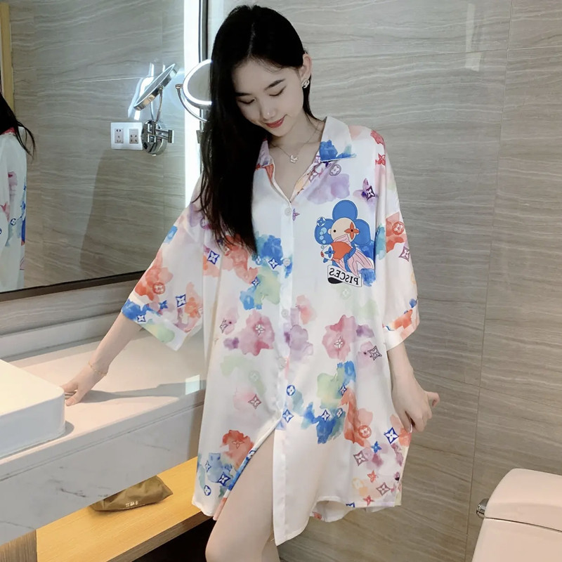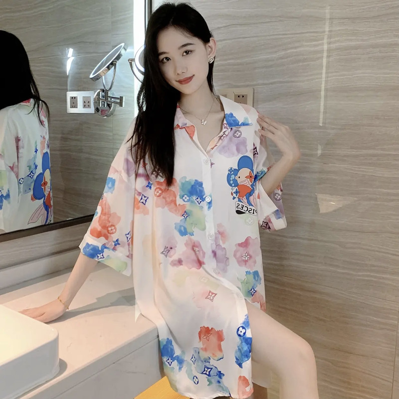 彼氏風パジャマ女性夏の薄い氷糸はシャツのスカートを着ることができます。