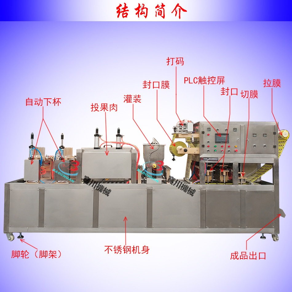 全自动操作:可自动完成落杯、灌装、放膜、封口、出杯等整个生产流程。其中的技术配置可根据客户的不同需求调节增减。