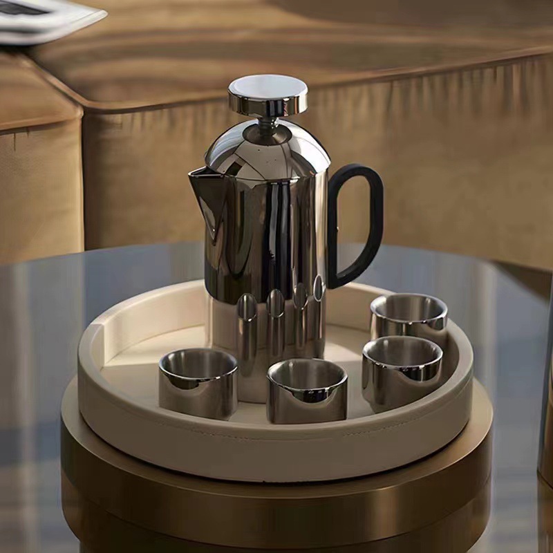現代の軽い豪華なステンレスのコーヒーポットのアイデアは、デスクトップのリビングルームのリビングルームの装飾品のサンプルプレートの間にあります。