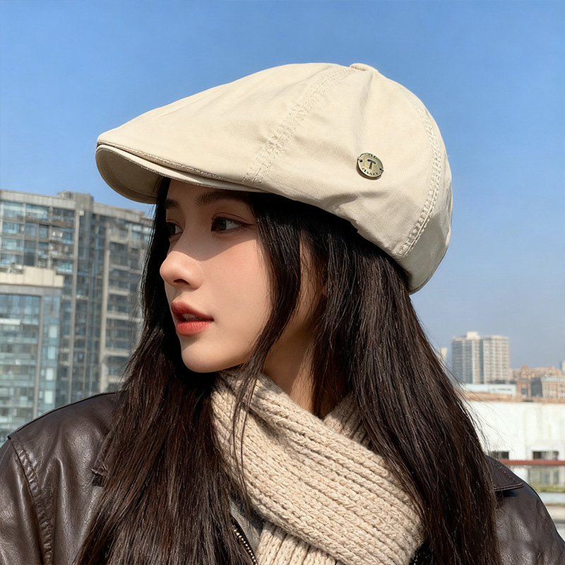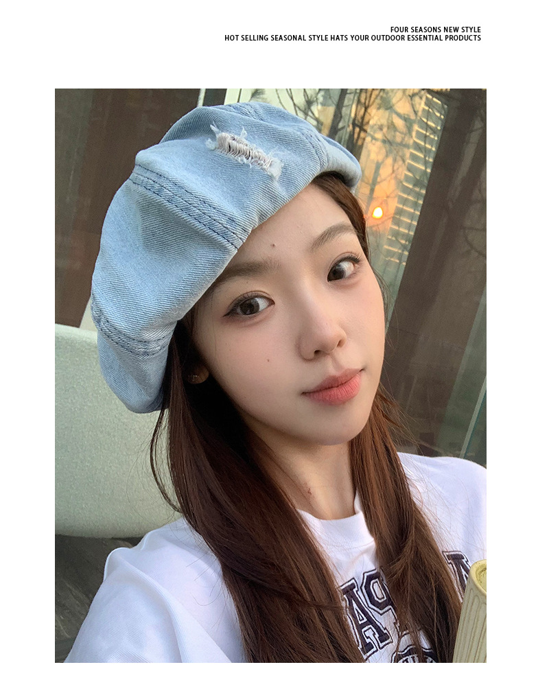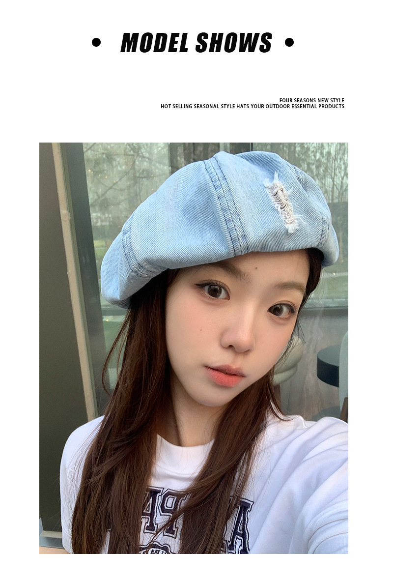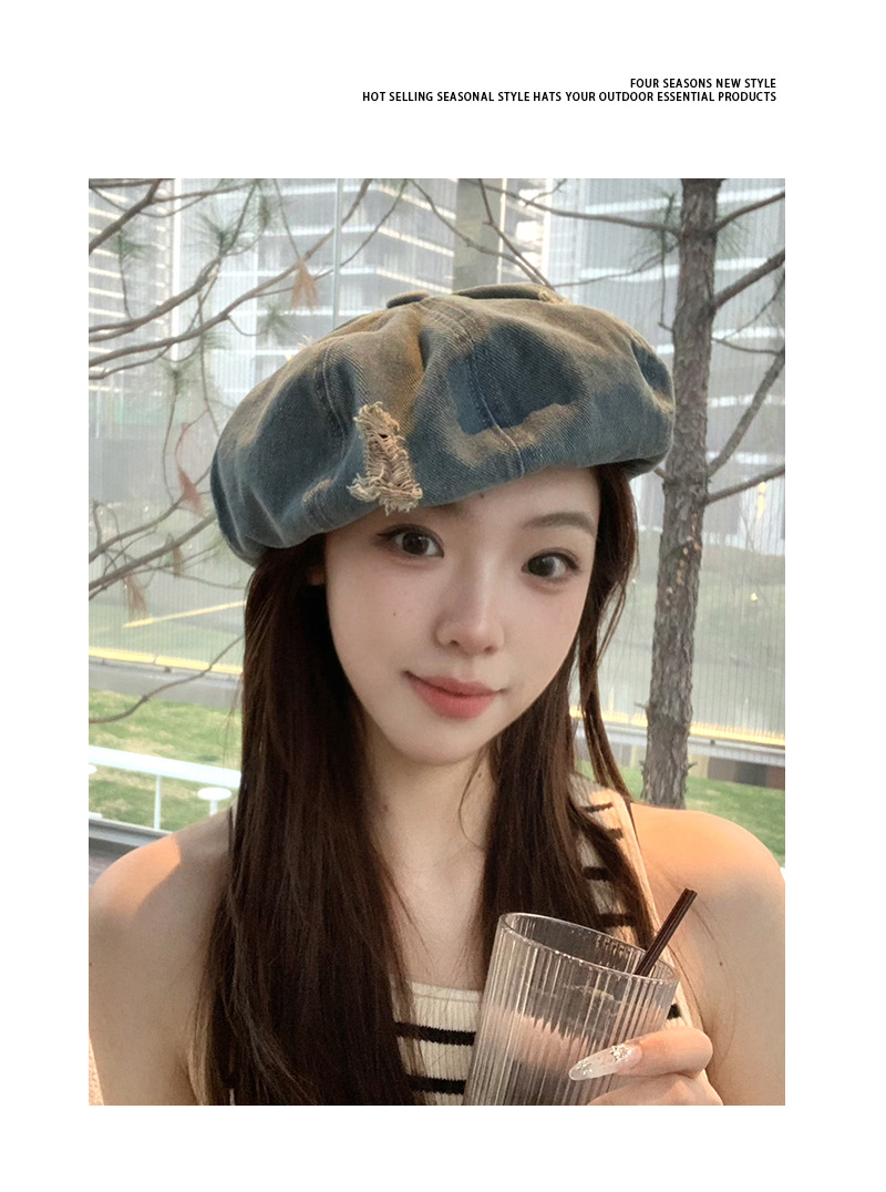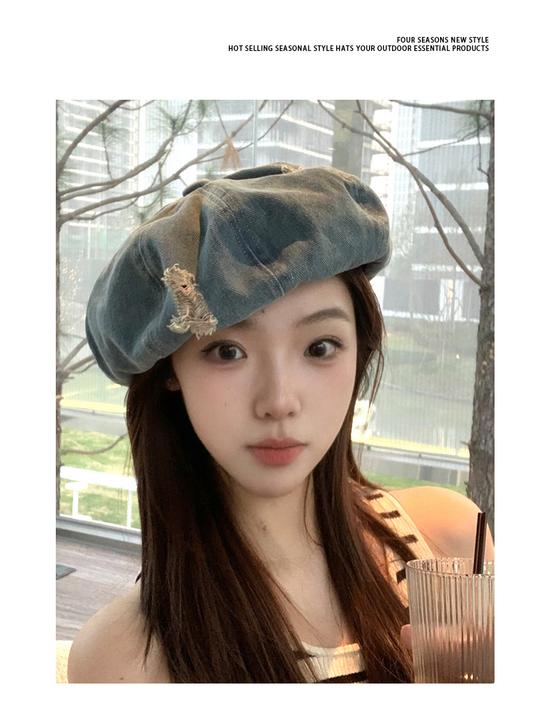 2024新型カウボーイ破洞ベレー帽女子春秋百合画家帽レトロ水洗い古い八角帽子潮