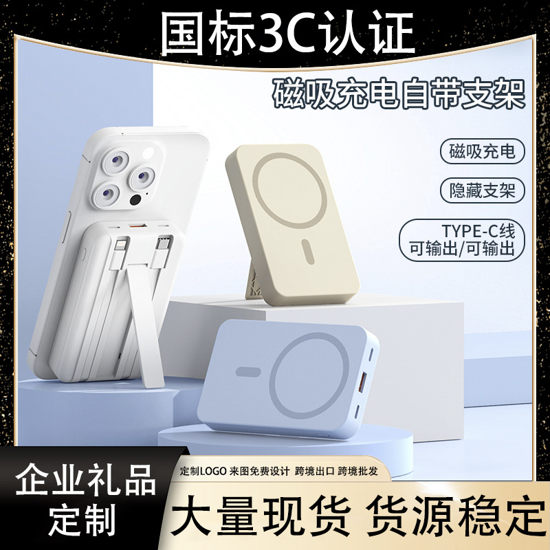 跨境新国标3c认证充电宝超级快充自带线支架无线磁吸移动电源定制