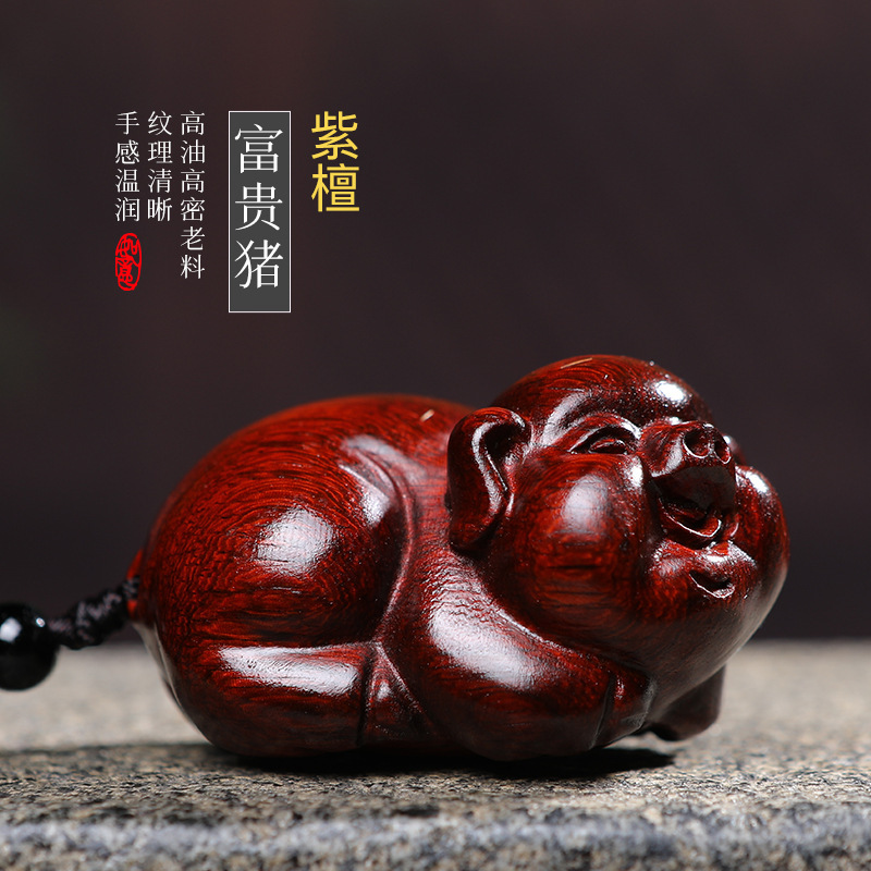 【富貴豚】紫檀木彫りの置物実木の家庭用装飾の取っ手はペンダントを遊んで贈り物をします。
