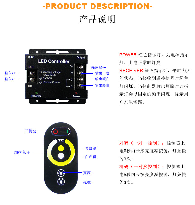 仕様 ワイヤレス2色タッチリモコン,ワイヤレスモノクロタッチリモコン,RGBワイヤレスカラータッチコントローラー
