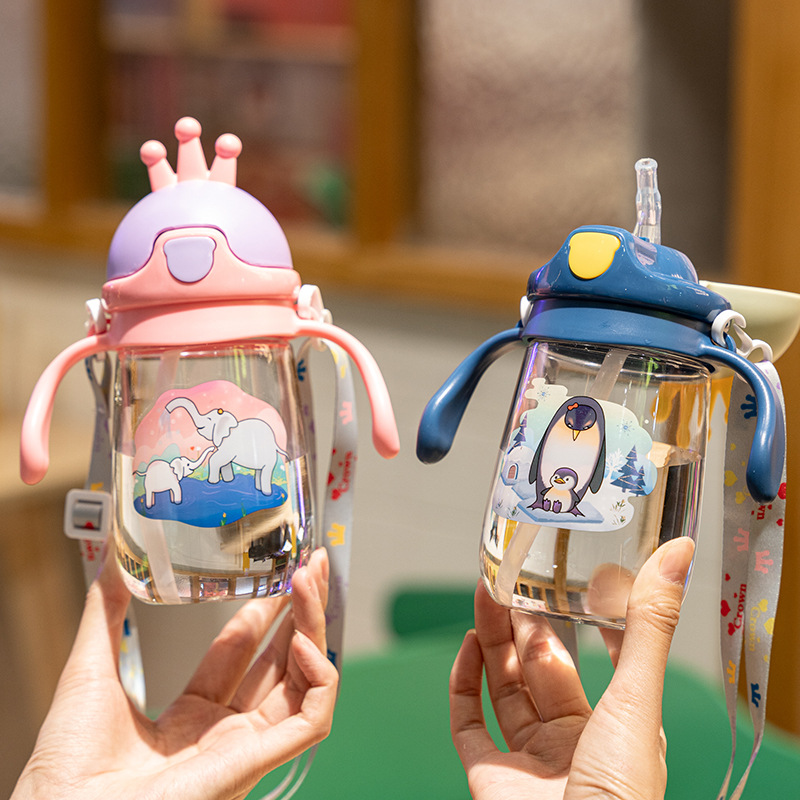 小学生向け携帯用落下防止幼稚園用ストロー付き水筒、ハンドル付きベビー子供用カップ、漫画柄ストロー付きカップ