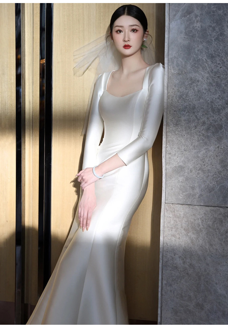 シンプルな軽ウェディングドレス2025秋サテン長袖森系スリムドレス花嫁外出用ドレス旅行撮影用ロング軽ウェディングドレス