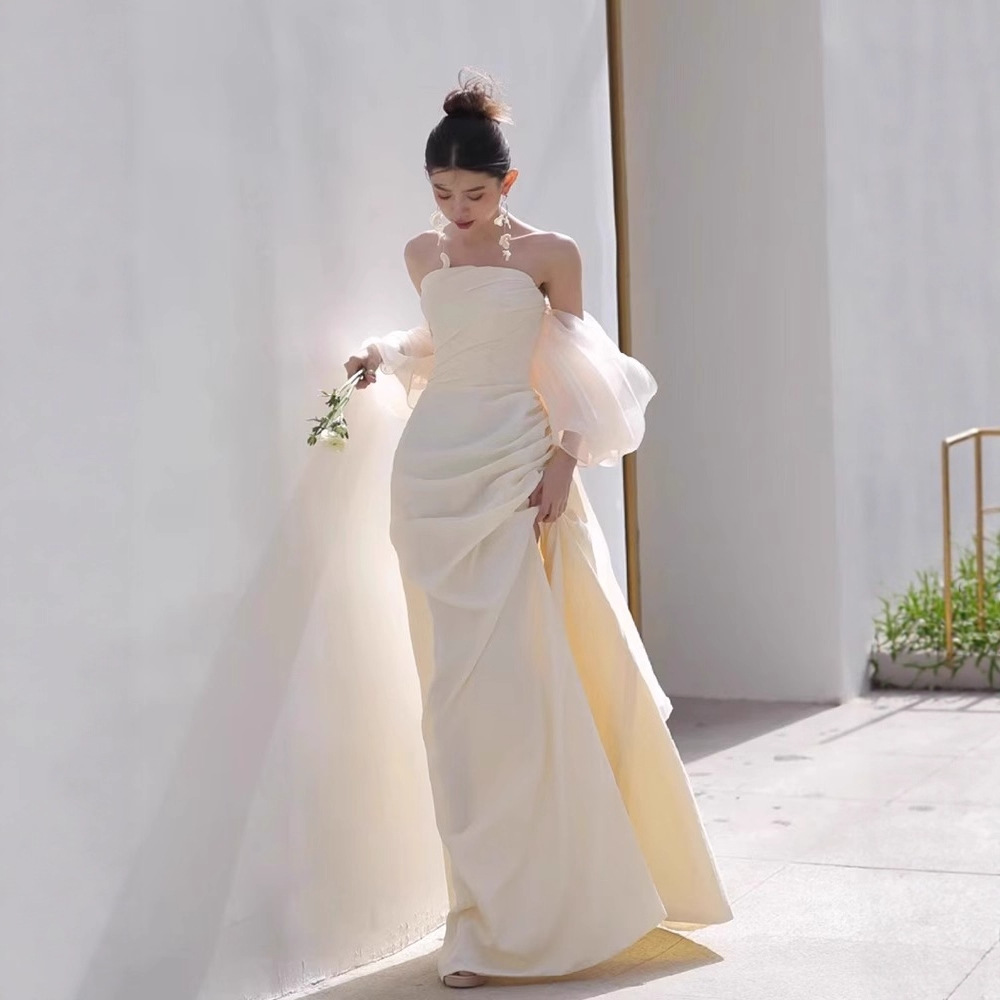 旅行写真ライトウェディングドレスフォレストスタイルスーパーフェアリーシンプルなホワイトサテンイブニングドレス女性のための 2025 新しい結婚式の外出糸長袖