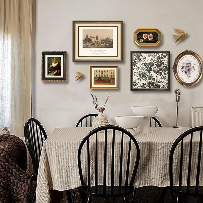 現代的なフランス式の中古風なアメリカ式のレトロな客間の低い棚の装飾画の玄関のレストランの背景の壁は絵の組み合わせを掛けます。
