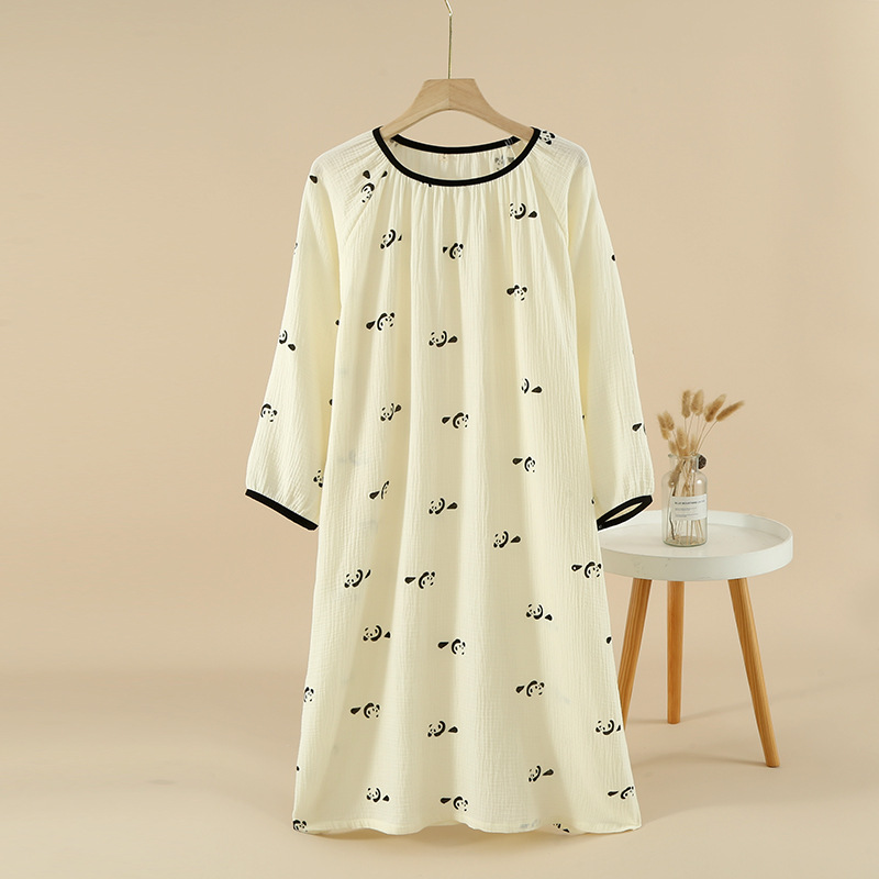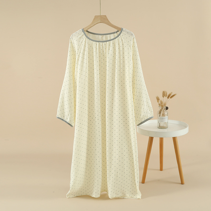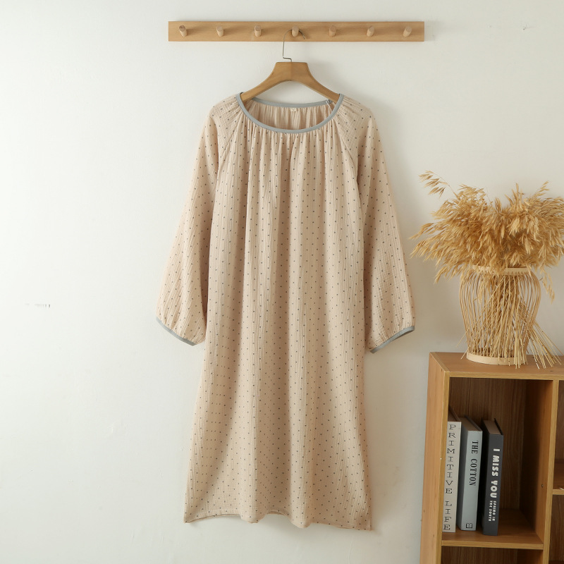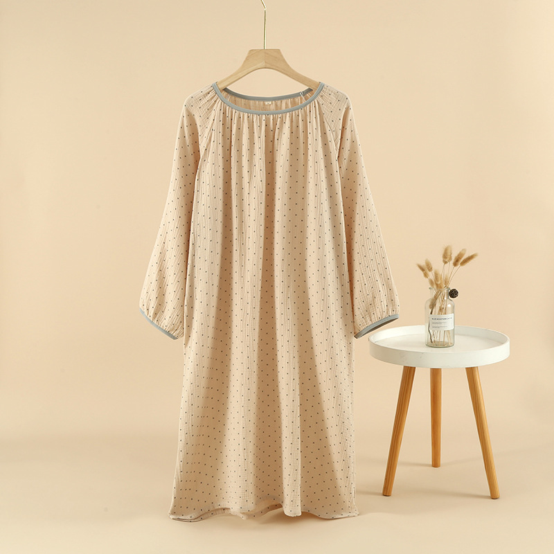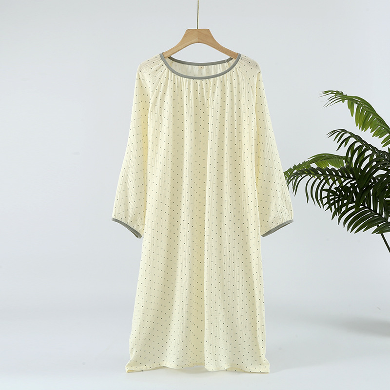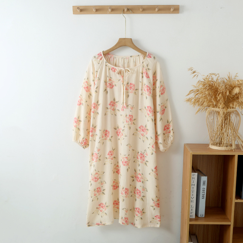寝ているスカートの女性の綿のガーゼの縮みの布の春夏の長袖の家のスカートの柔らかいゆったりしているパジャマの家の服の薄いタイプは外に着ます。