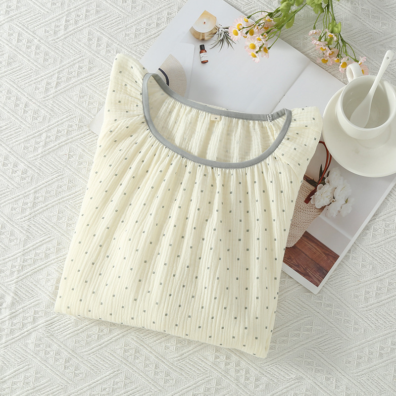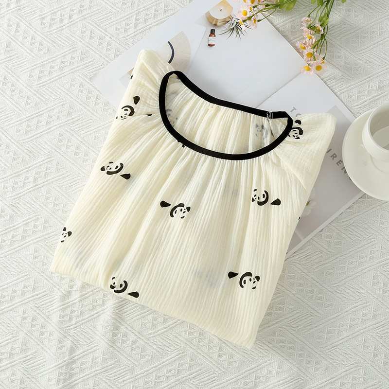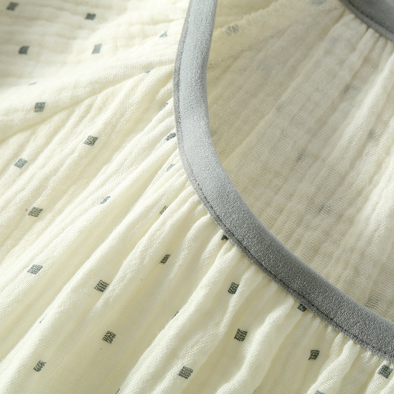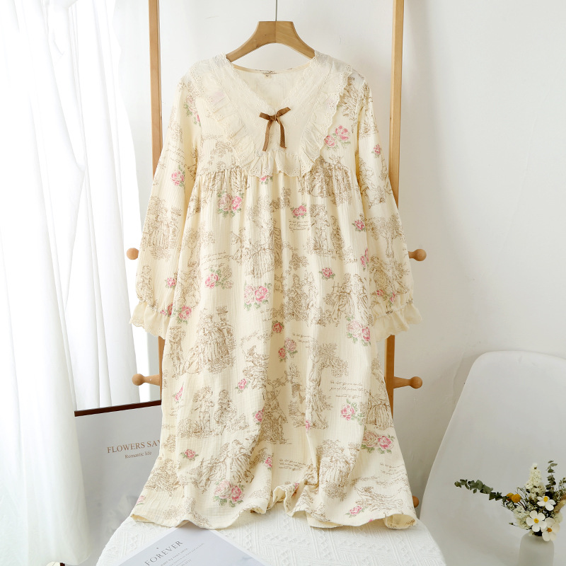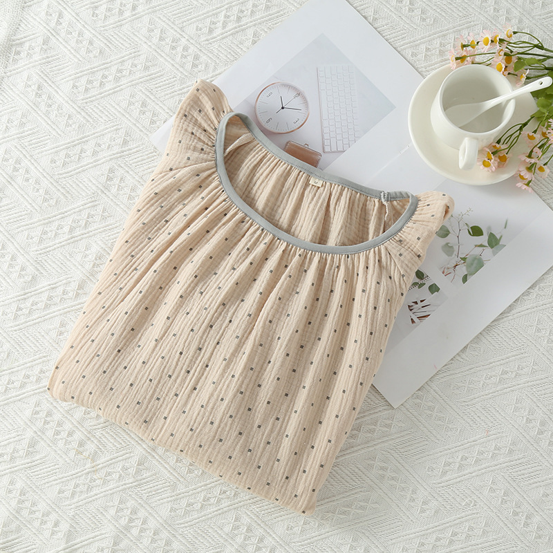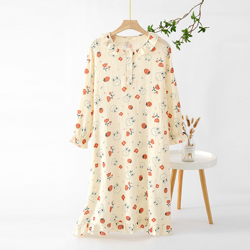 寝ているスカートの女性の綿のガーゼの縮みの布の春夏の長袖の家のスカートの柔らかいゆったりしているパジャマの家の服の薄いタイプは外に着ます。