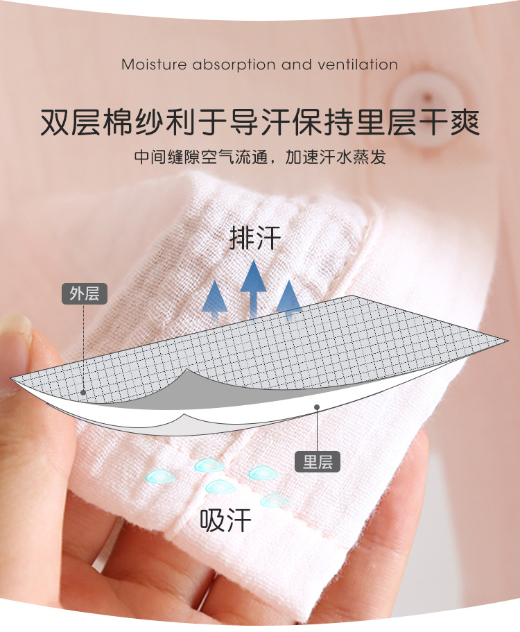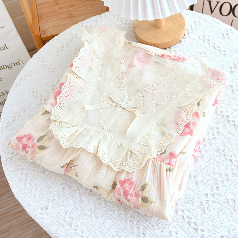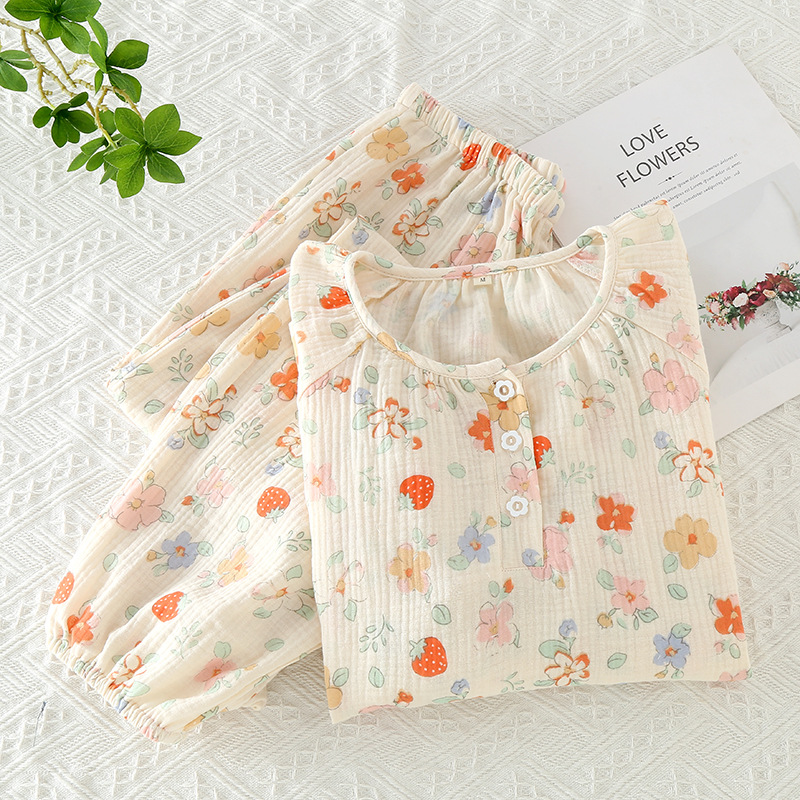 コットンクレープパジャマレディース二重ガーゼゆったり吸汗セット秋冬三色桃心ホームウェア