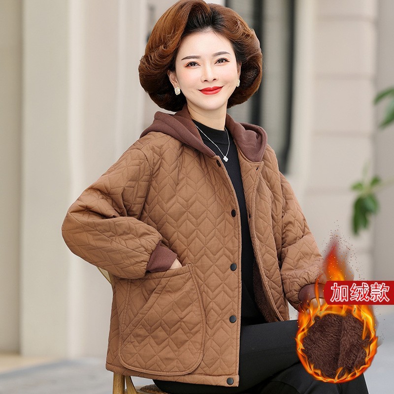 お母さんの秋冬のベルベットのコートの洋風の小さい綿入れの服のファッションの帽子の短いタイプの中高年の女性の冬の服は綿入れの上着を厚くします。