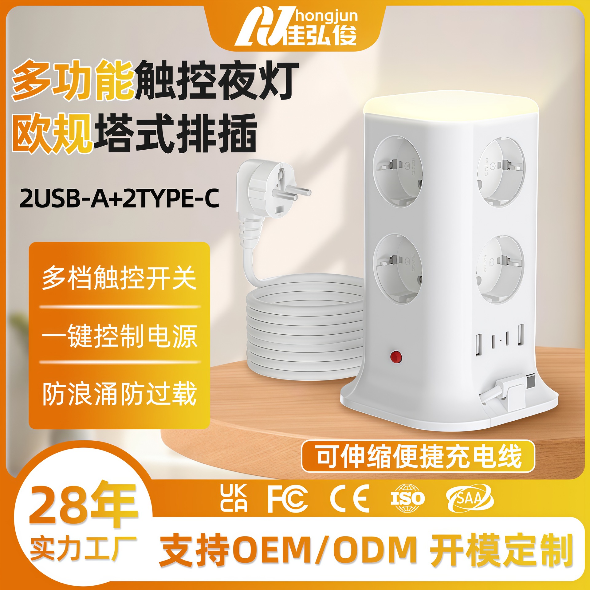 家用多功能欧规触控夜灯塔式八孔带USB排插带C口伸缩线韩规插座