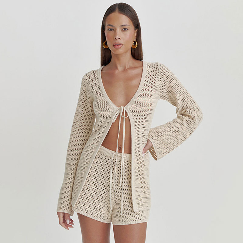 ヨーロッパとアメリカの新しいセクシーな透かし編みニットビーチビキニ水着カバーアップ長袖カーディガンショートパンツセット(女性用)