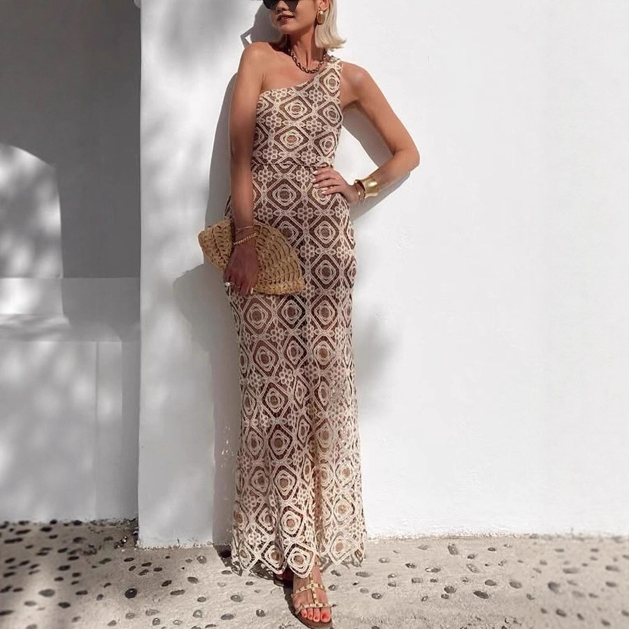 跨境欧美独立站亚马逊女装连衣裙斜肩无袖方形针织蕾丝钩花女8173