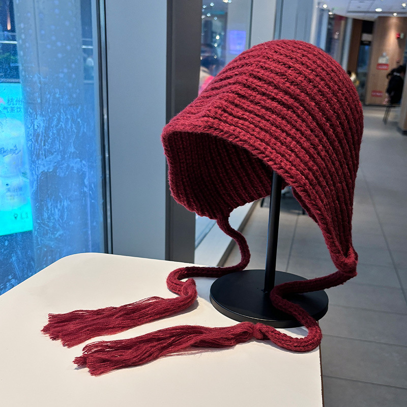 2025新款辫子护耳针织帽大圆脸适合的帽子保暖毛线帽女秋冬酒红色
