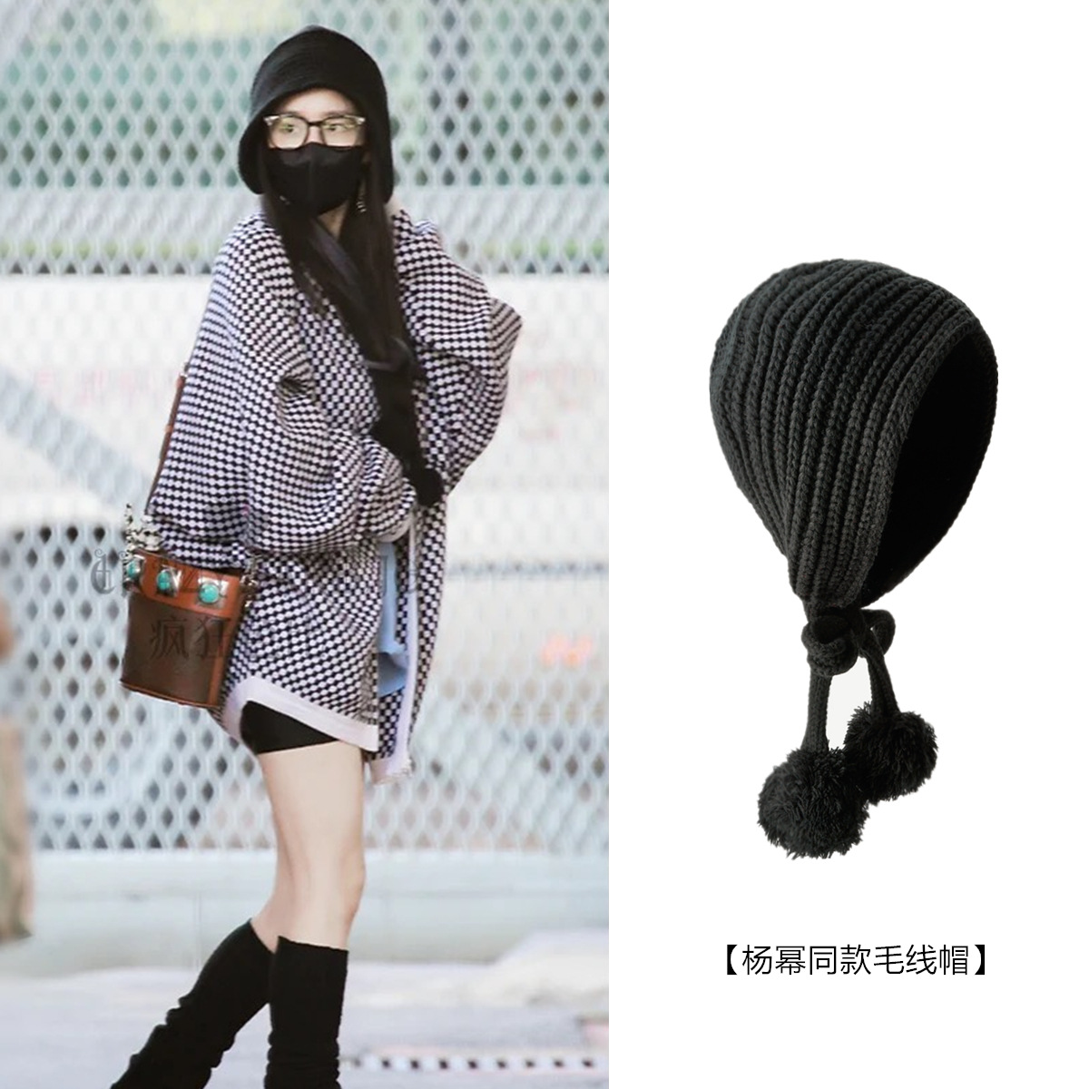 杨幂同款黑色毛线帽子女秋冬保暖护耳学生百搭网红长辫子针织帽潮