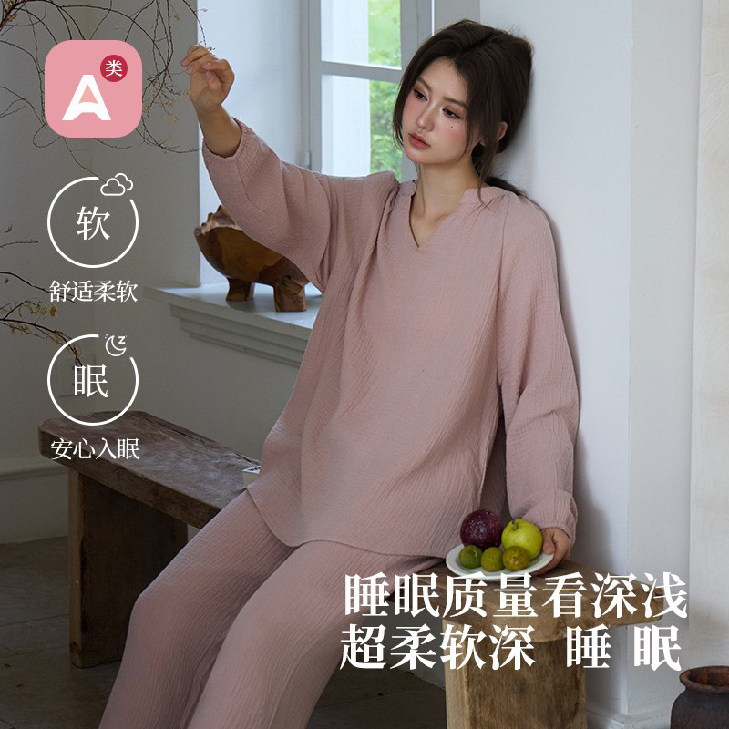 2025新款纯色简约风纯棉双层纱布睡衣女春夏秋季薄款长袖居家套装