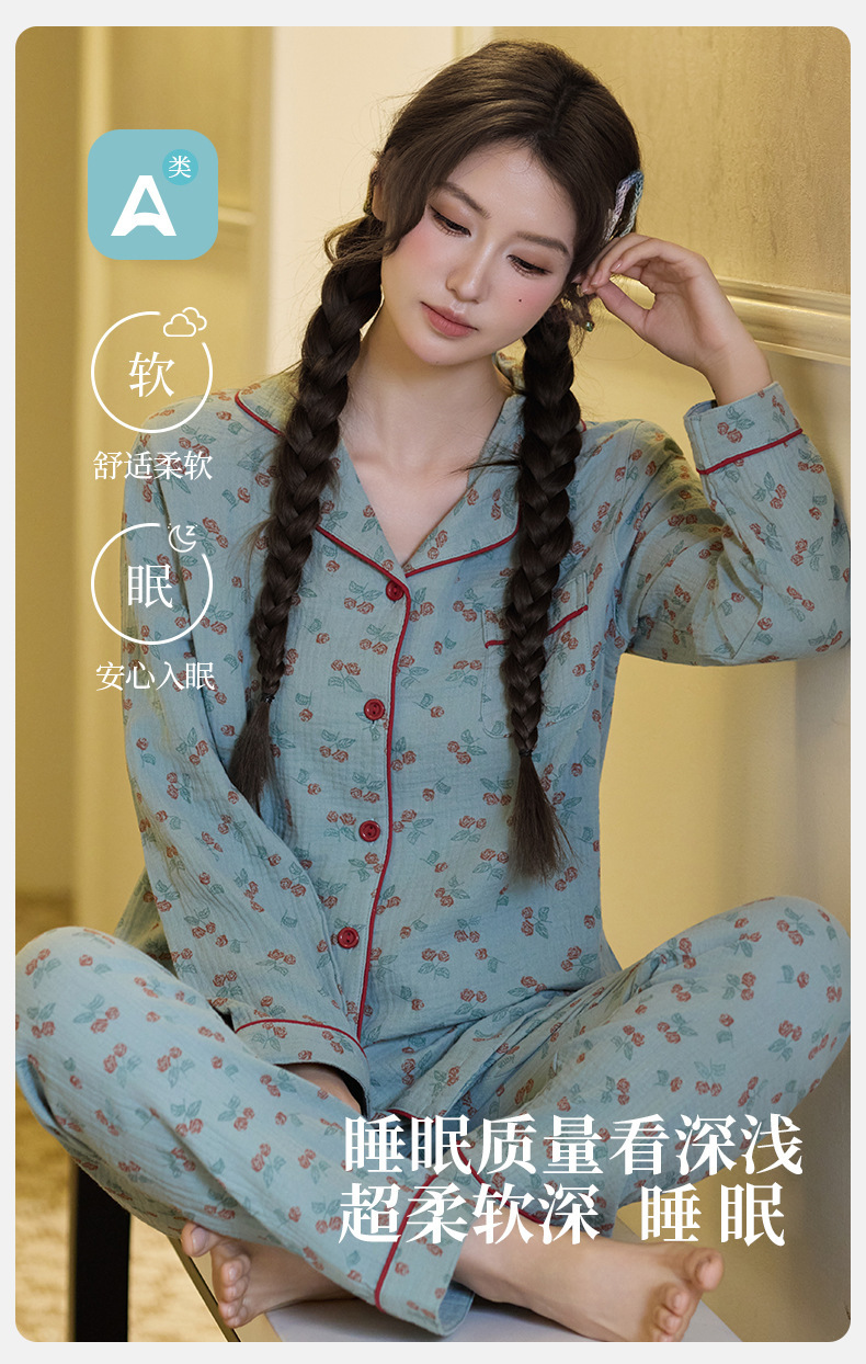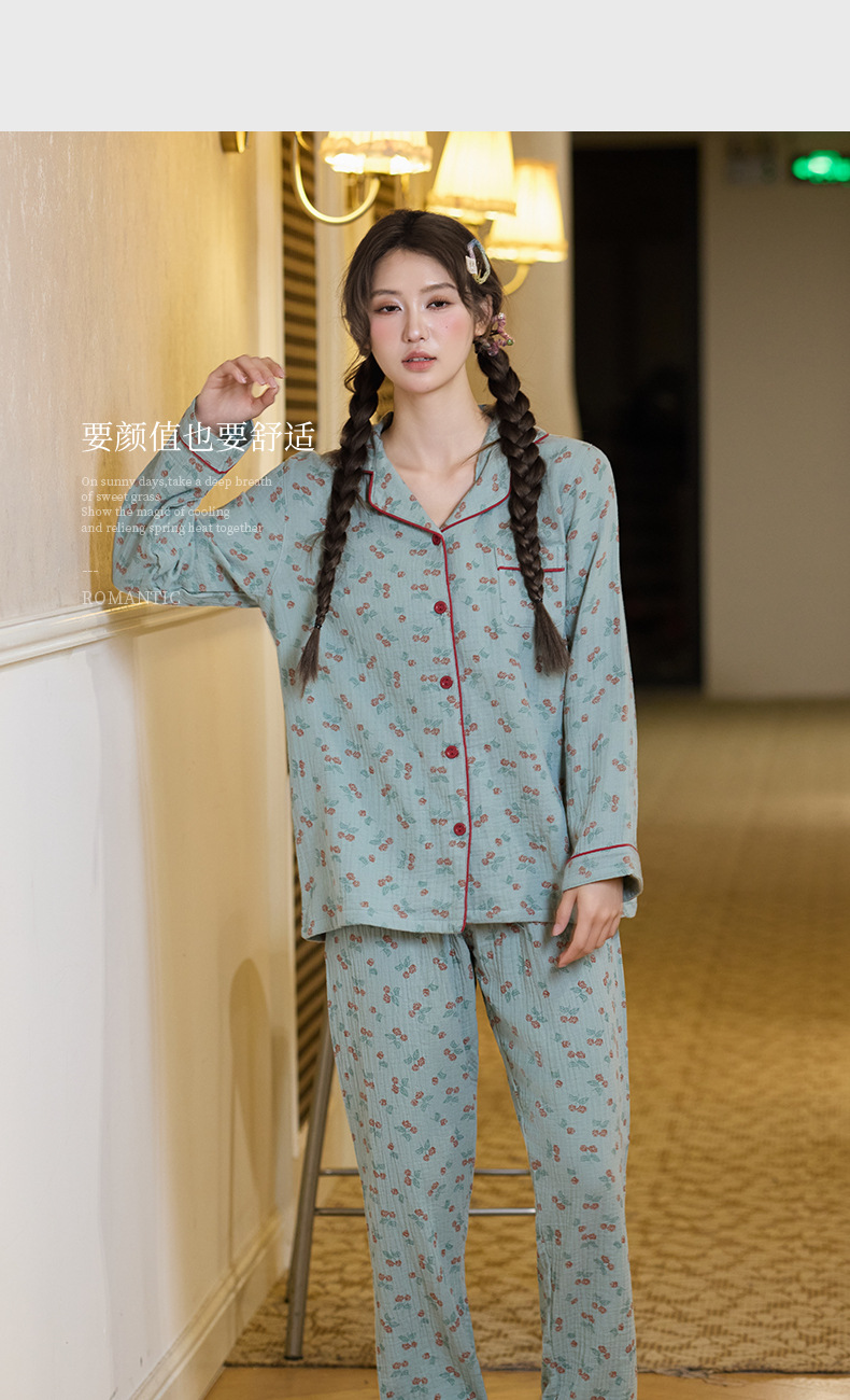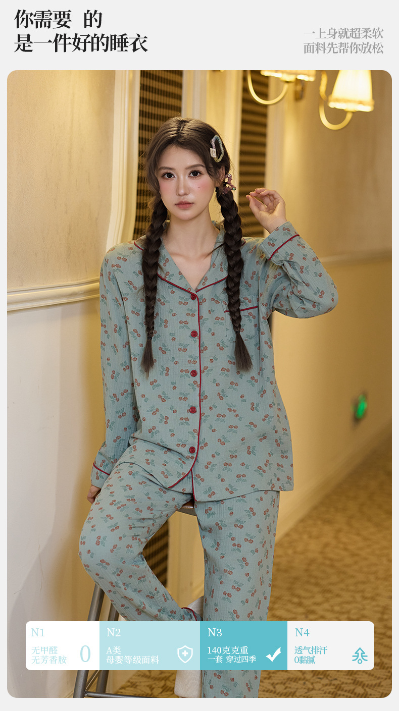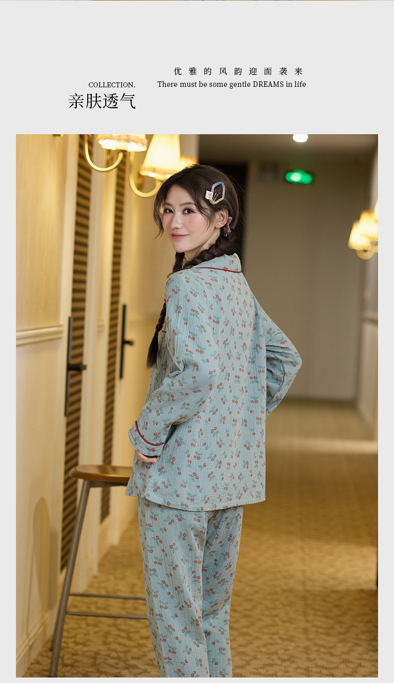 純綿二重ガーゼパジャマレディース新型森系さくらんぼ春秋長袖綿100% ゆったりホームウェアセット