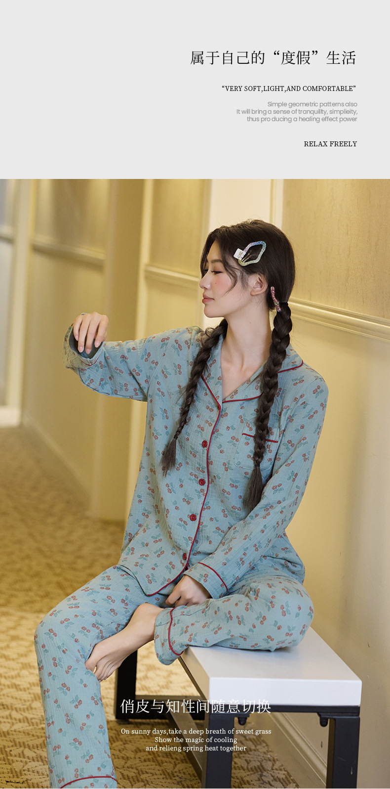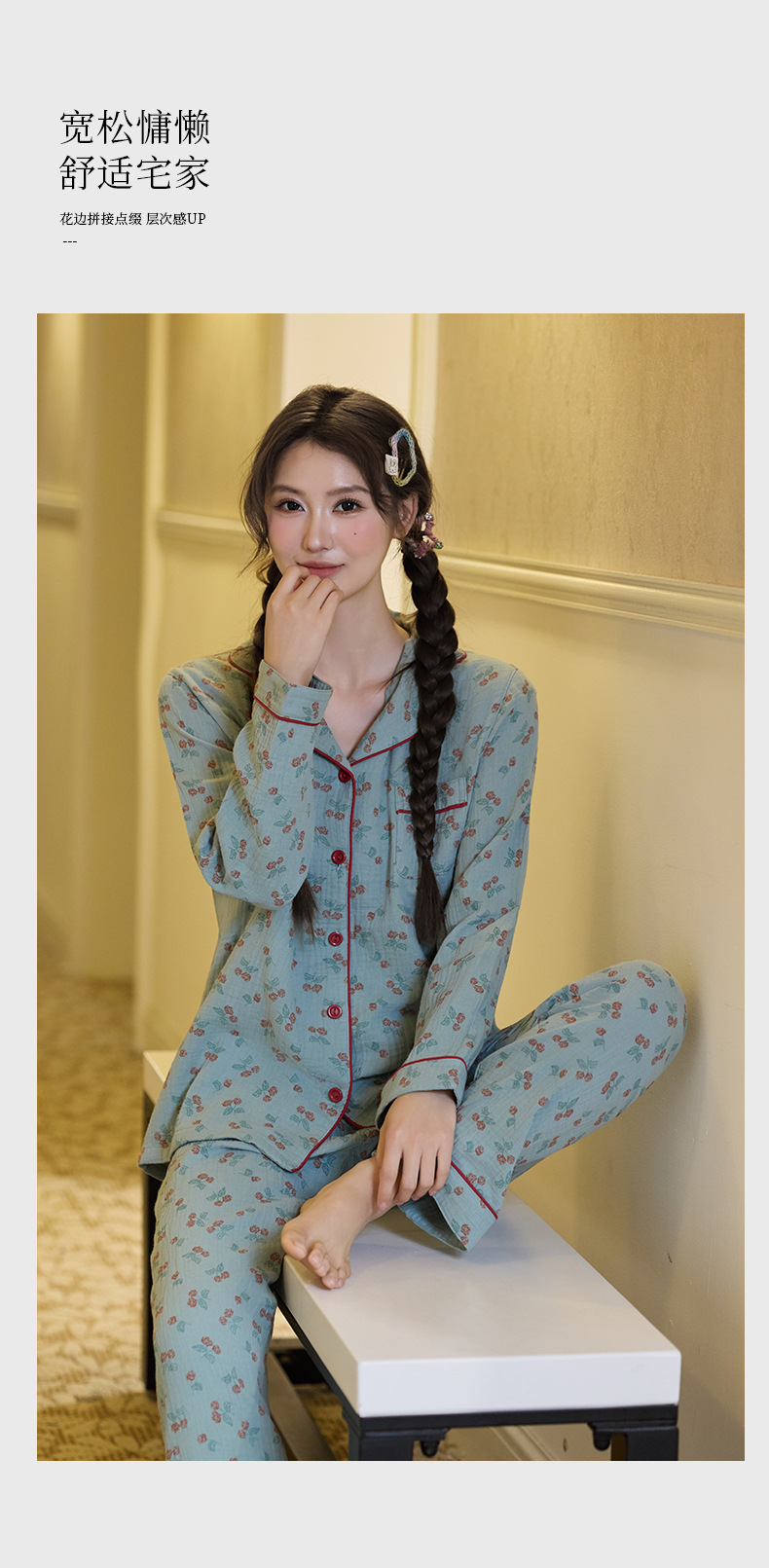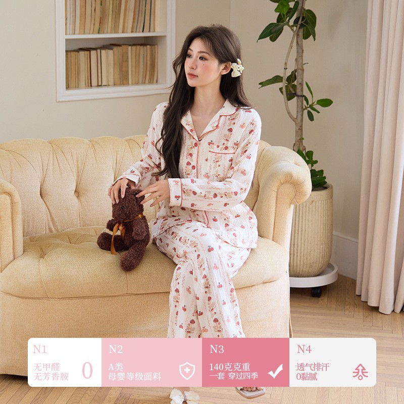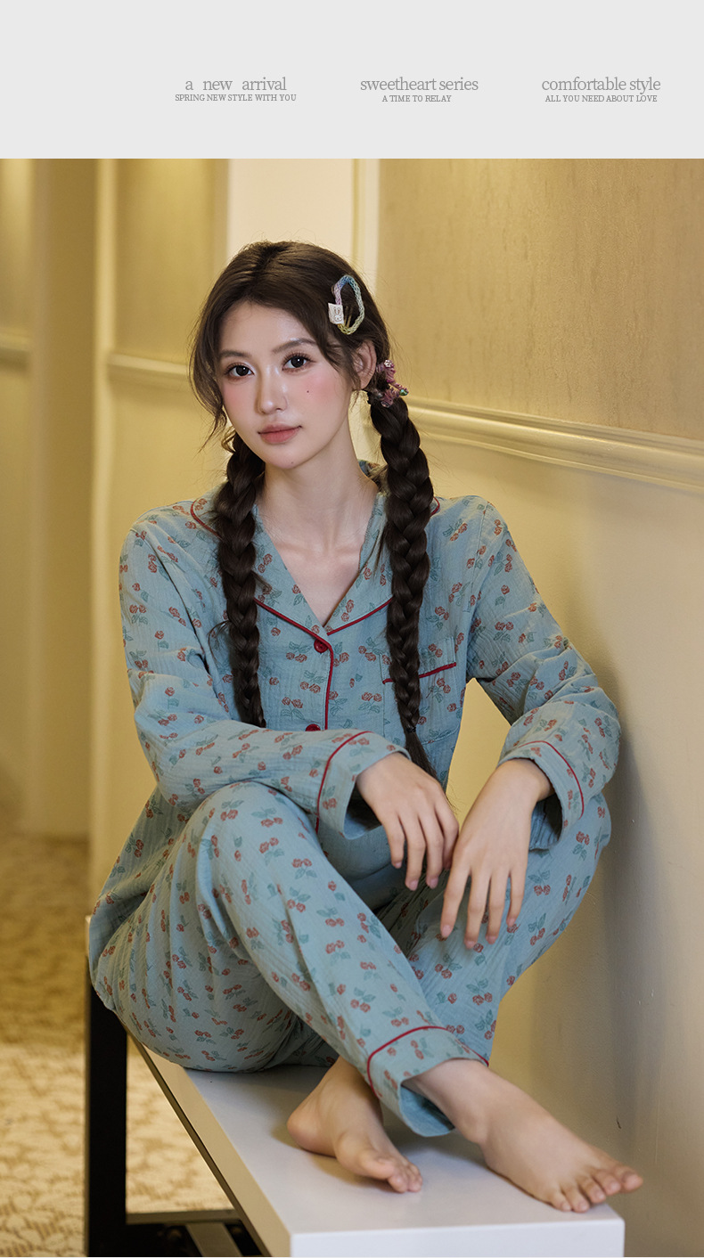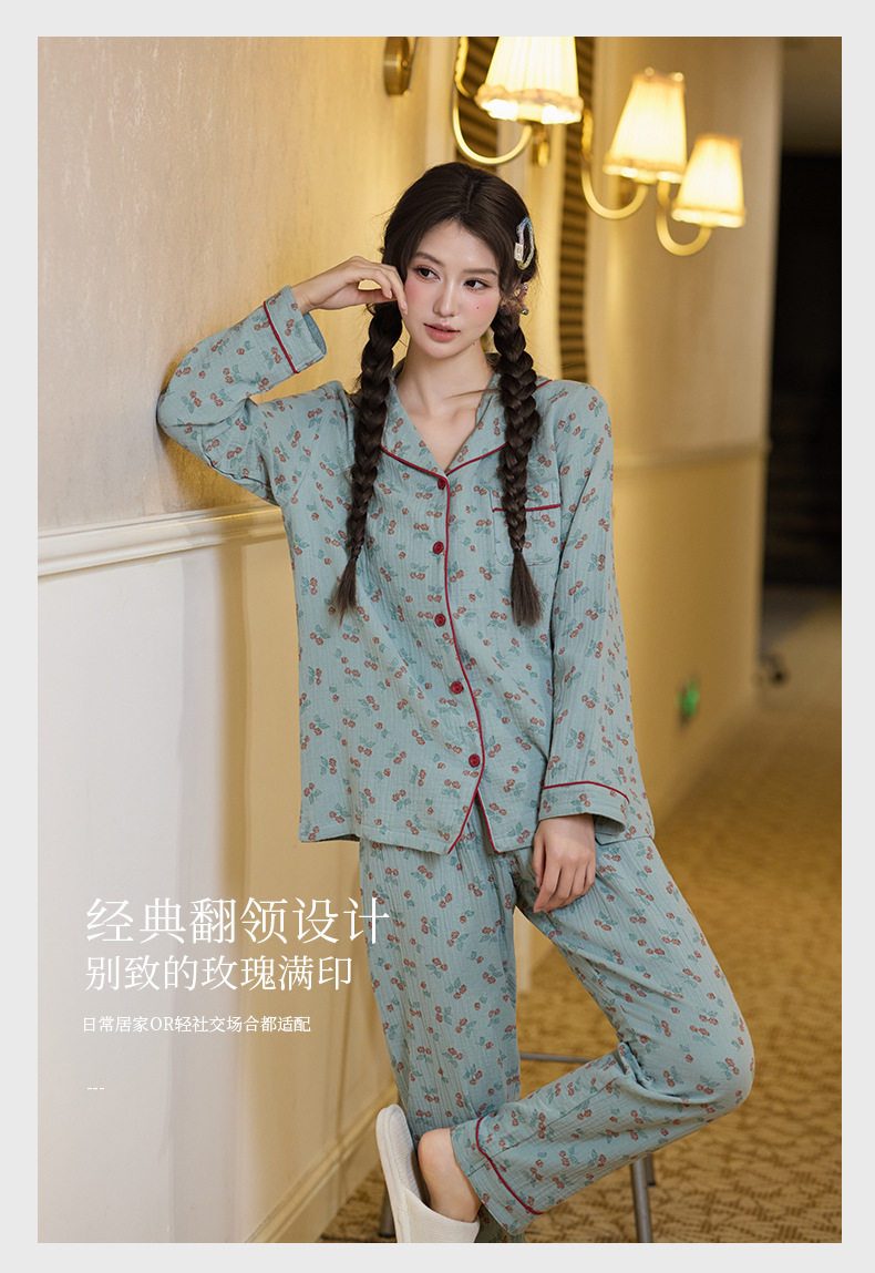 純綿二重ガーゼパジャマレディース新型森系さくらんぼ春秋長袖綿100% ゆったりホームウェアセット