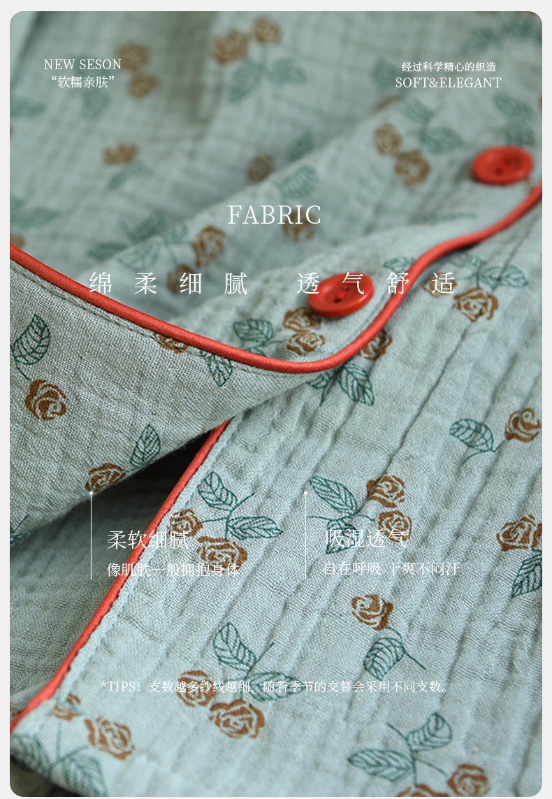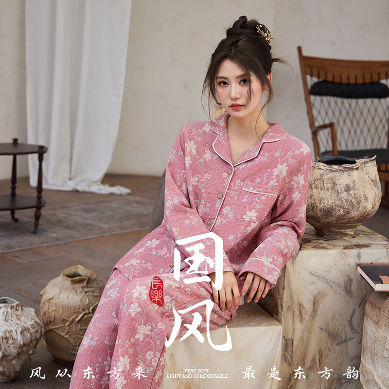 中国風パジャマ レディース 新中式 純綿二重ガーゼ 薄手 春秋 長袖 カスタムホームウェアセット 卸売