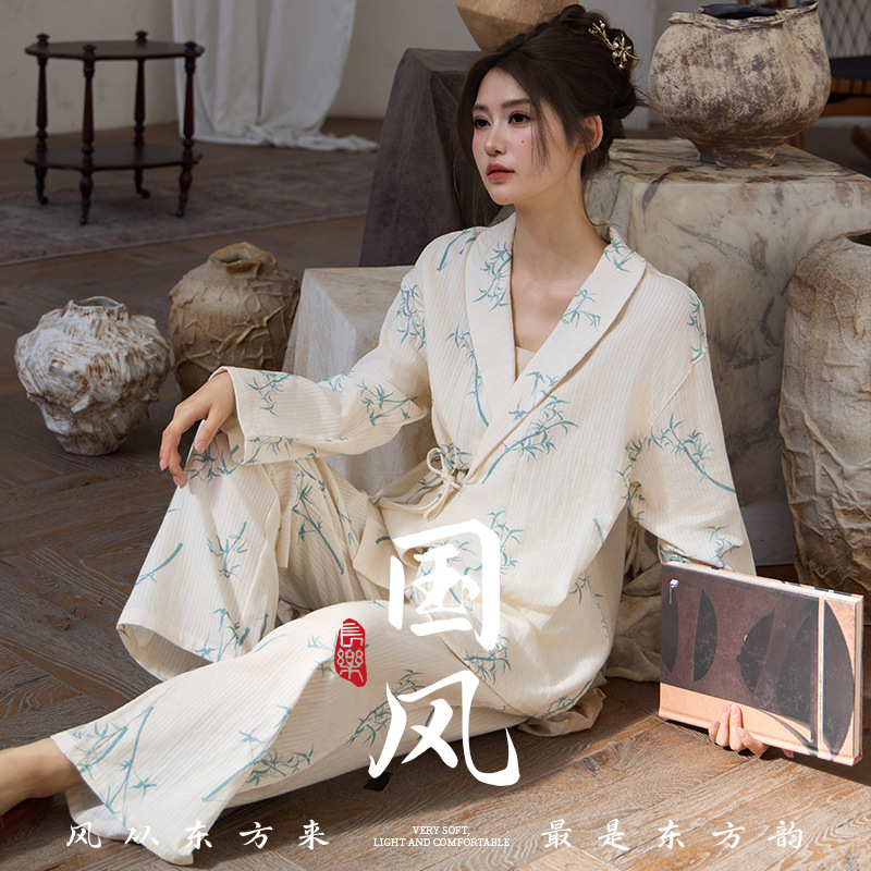 中国風の竹純綿二層ガーゼパジャマ女性のための春、秋、夏薄い長袖ルーズホーム服セット