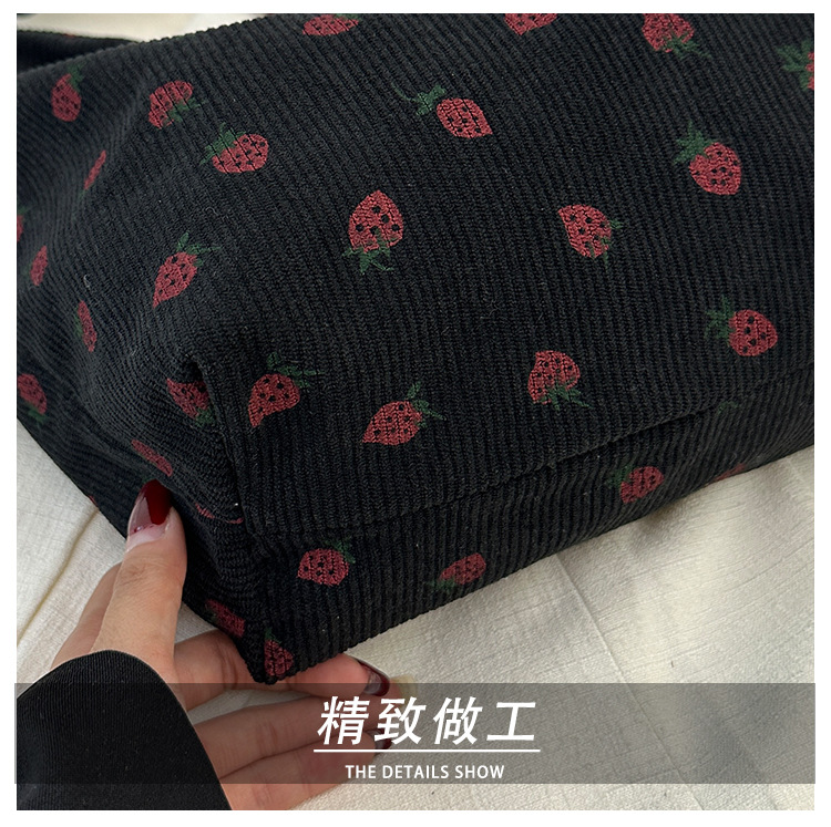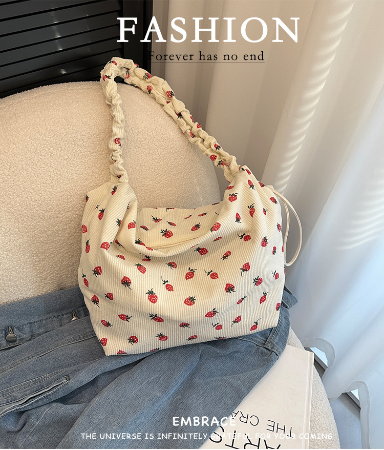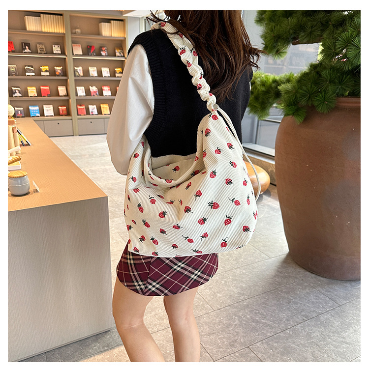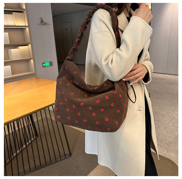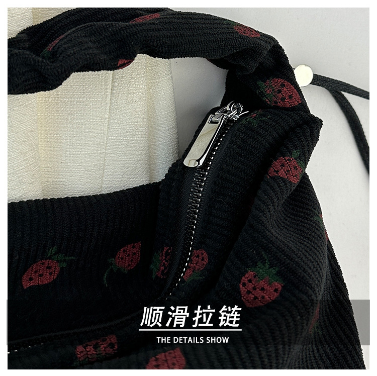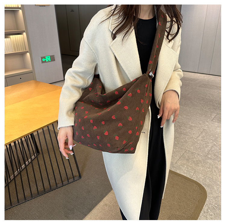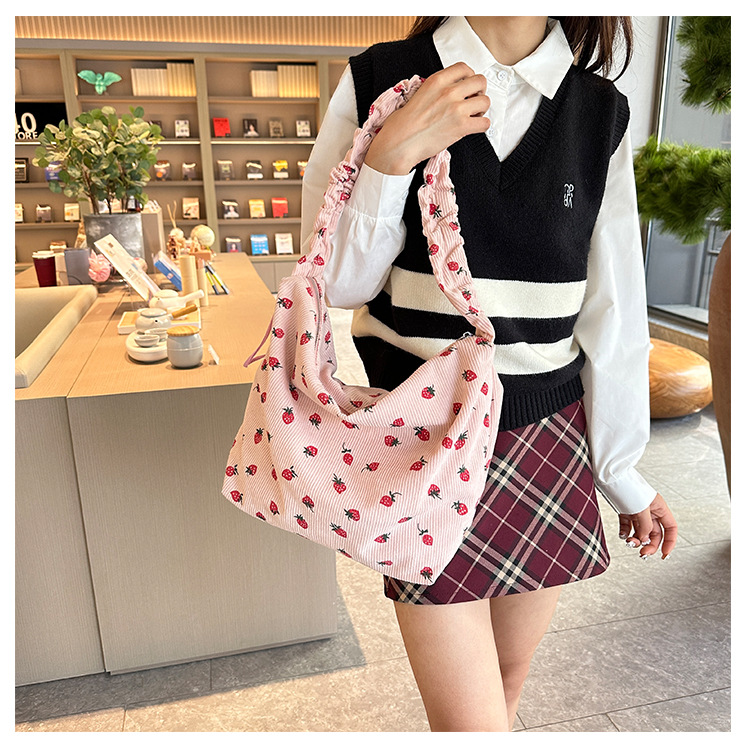 2024新型女性カバンファッションコーデュロイイチゴプリント大容量脇下カバン甘い風斜めショルダーバッグ