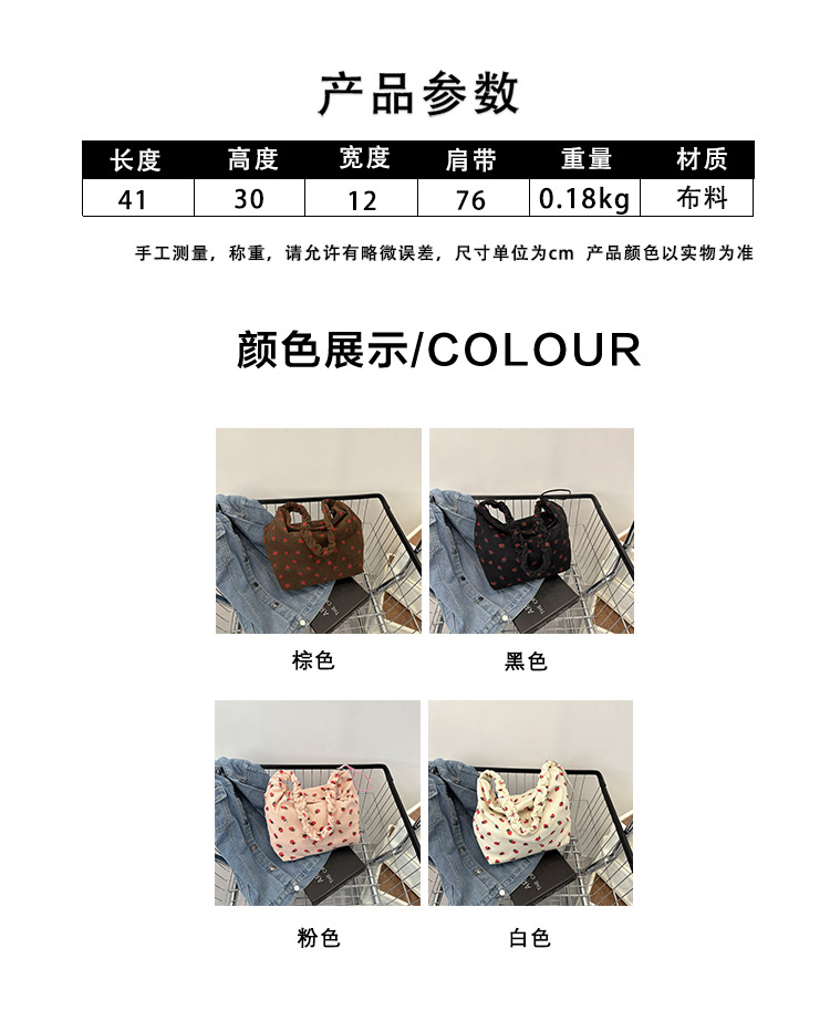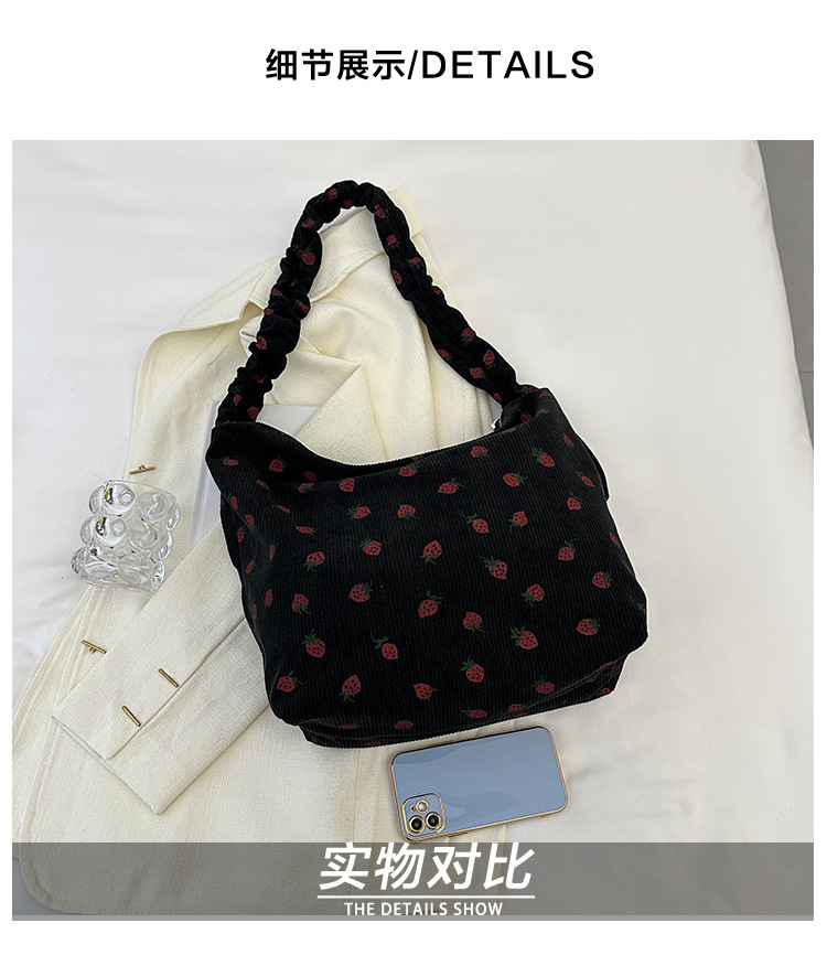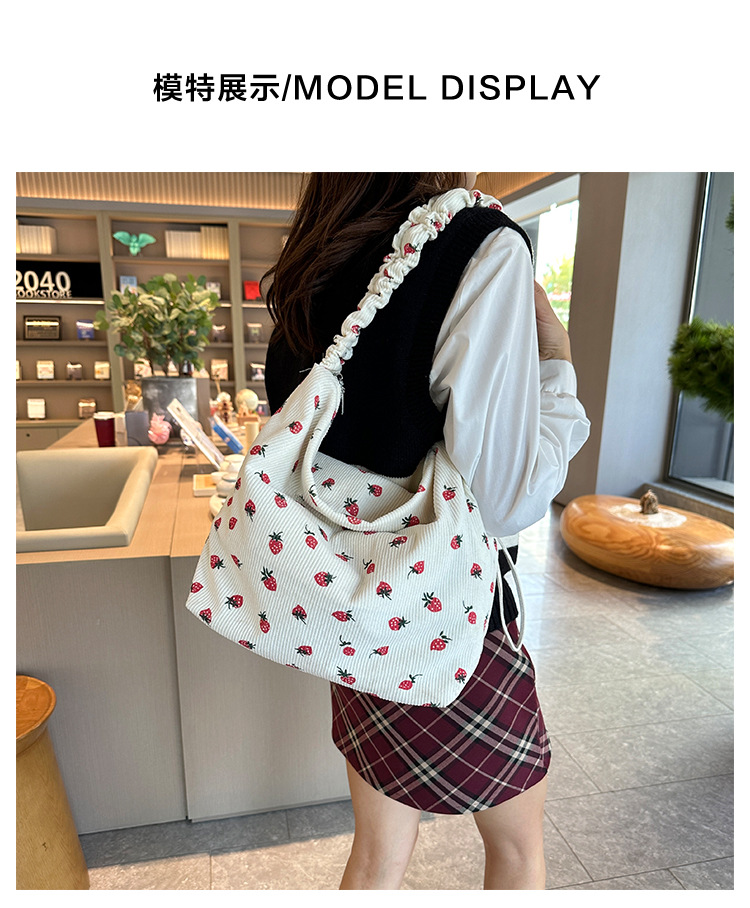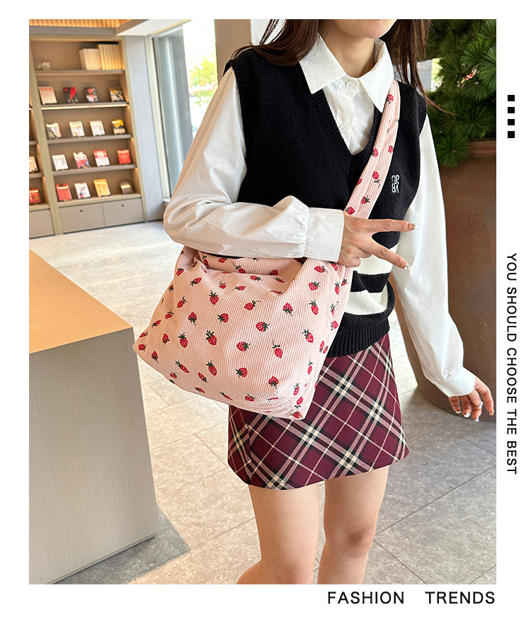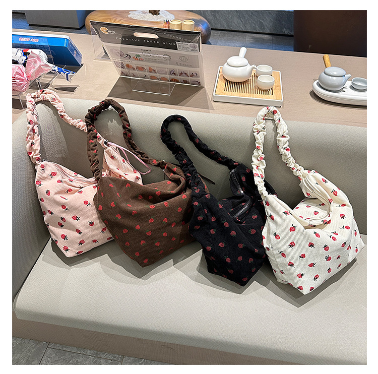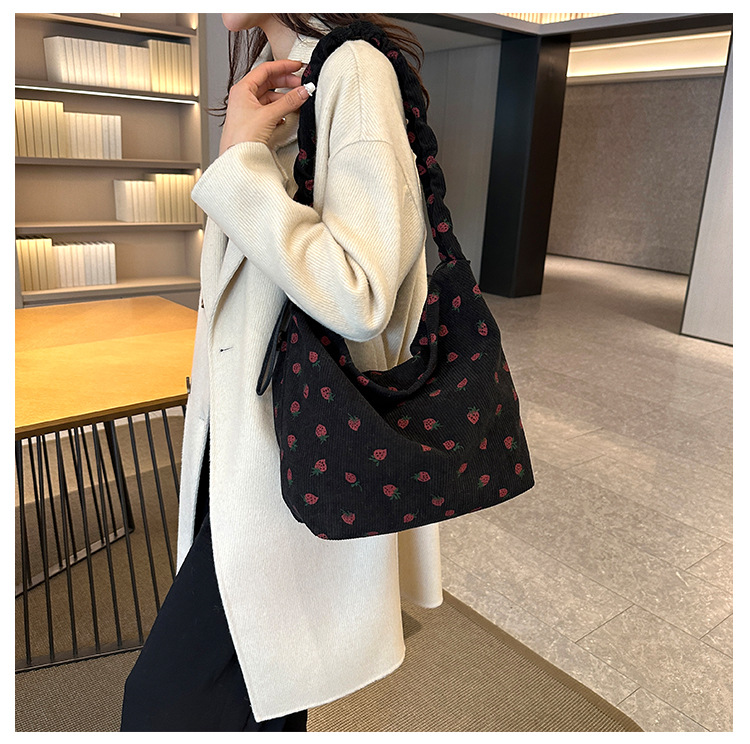 2024新型女性カバンファッションコーデュロイイチゴプリント大容量脇下カバン甘い風斜めショルダーバッグ