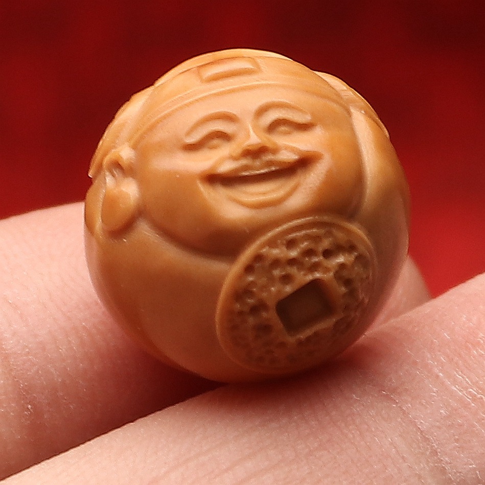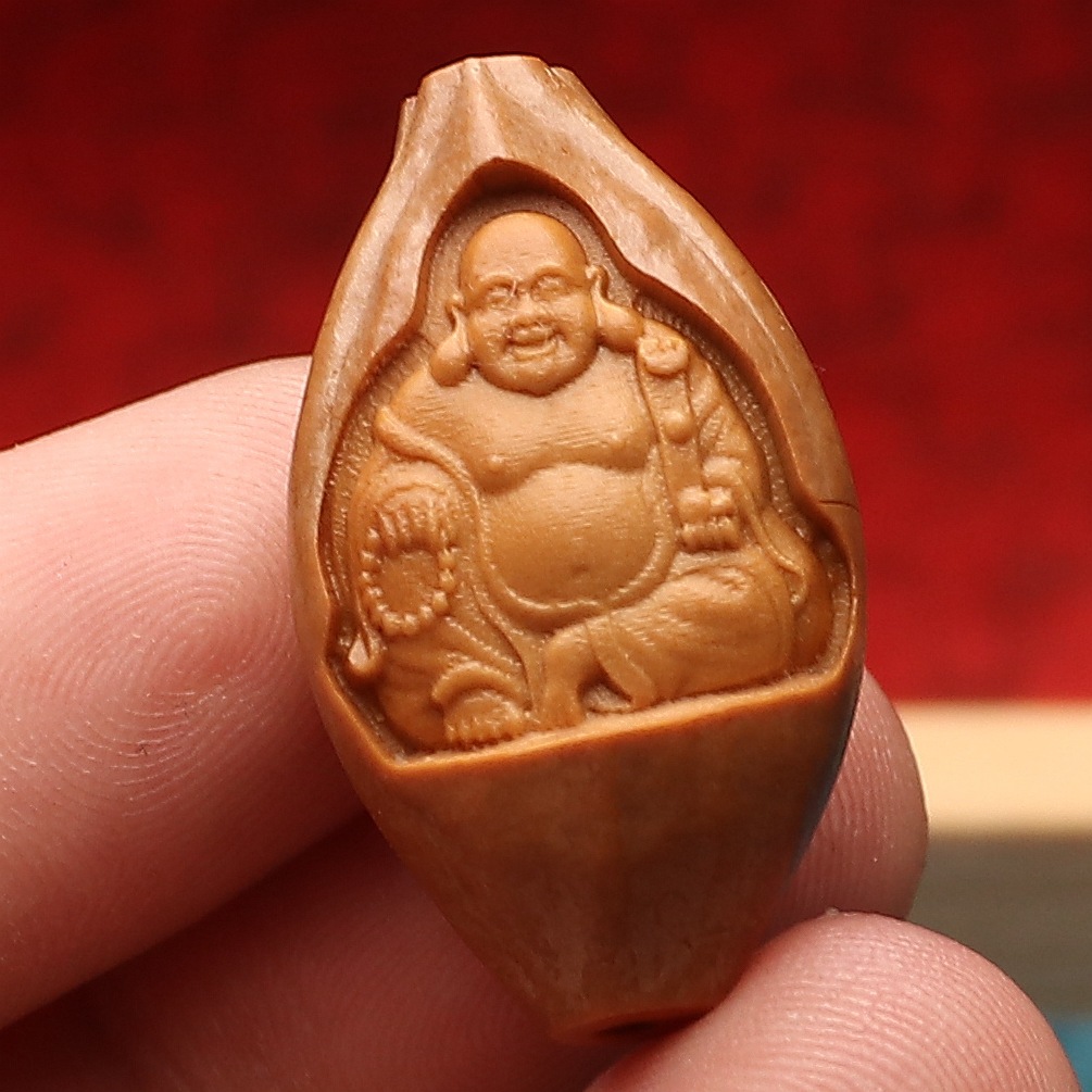 富と幸運の象徴として、男性と女性向けに手作りされたオリーブの種の富の神の小人をデザインしました。
