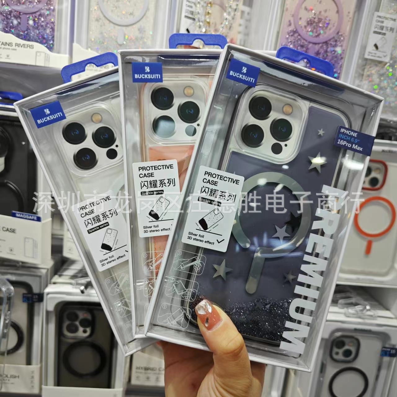 Iphone16 promax動的流砂フラッシュパウダー磁気吸引携帯ケースリンゴ15愛雪花保護カバーを適用する