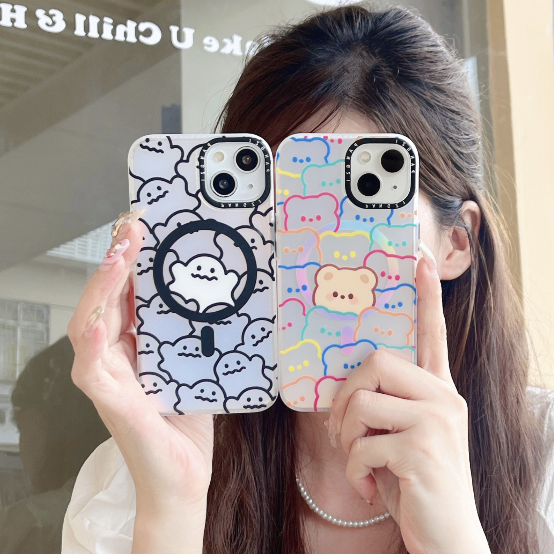 iPhone16promax対応 ラベル付き人形漫画風塗装スマホケース Apple17半透明つや消し磁気吸着ケース