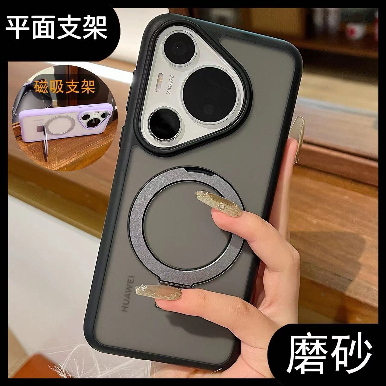 Huawei Pura70 Pro+、P80 Ultra、Mate60対応、半透明マット仕上げの透明ケース、マグネット式スタンド付き。