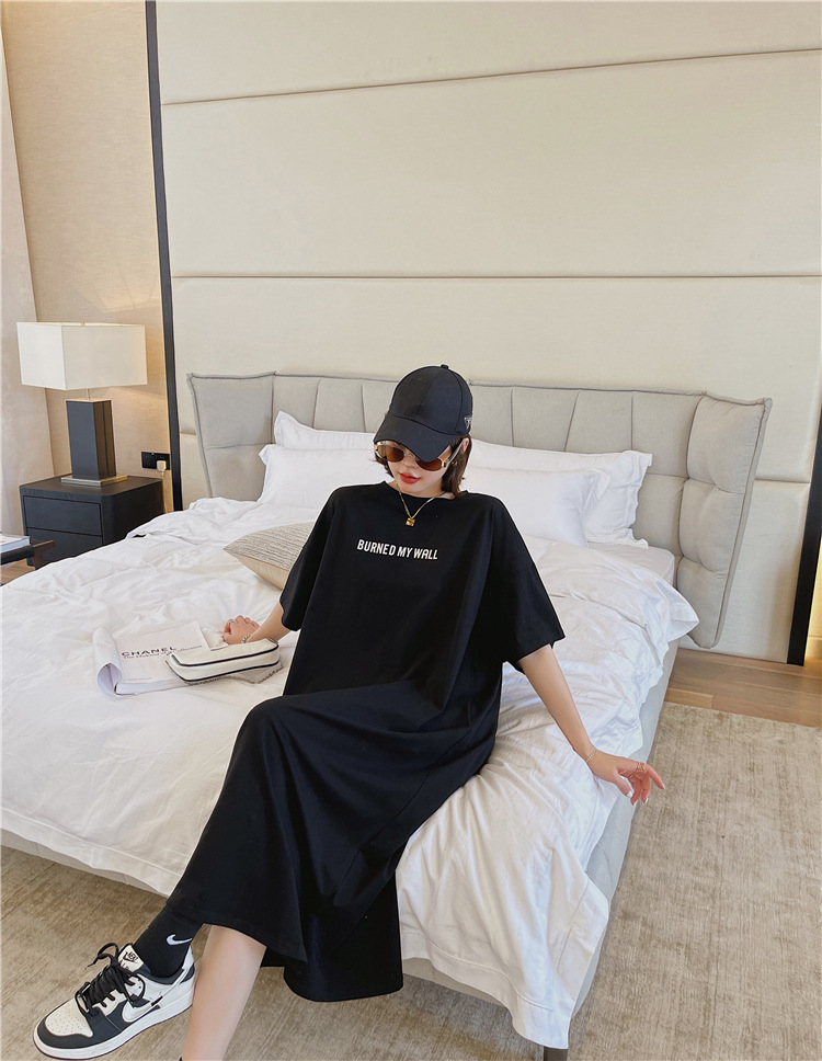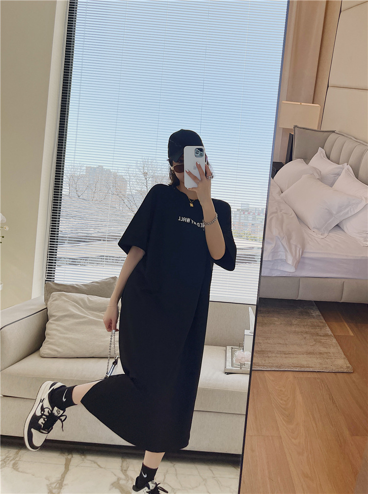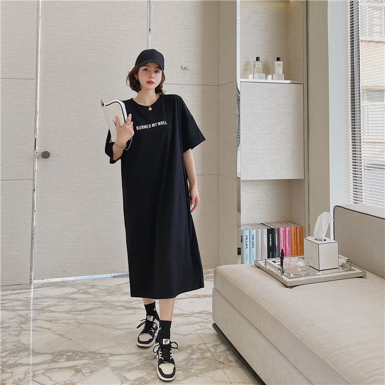 夏の韓国系の大きいサイズの婦人服はゆったりしていて、膝のtシャツのスカートのカジュアルなシンプルな洋風のアルファベットのプリントのワンピースをフォークします。