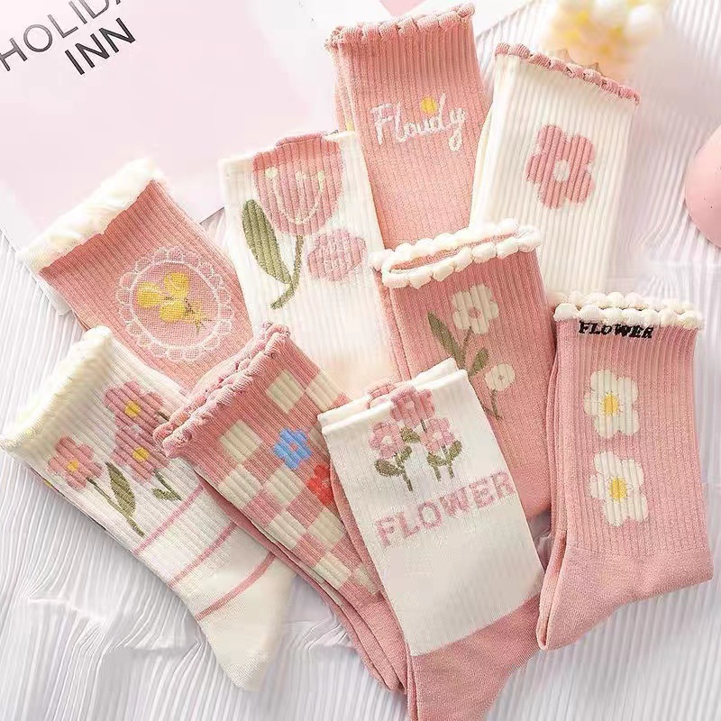 靴下レディースミドルストッキングピンク系レース甘い少女ins潮靴下ストッキング学生スポーツかわいい花の靴下