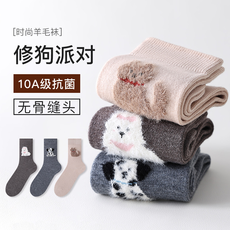 【修狗派对】秋冬用ウールソックス3足セット、多用途でトレンディなノンスリップ保温ソックス、卸売植毛中筒ソックス