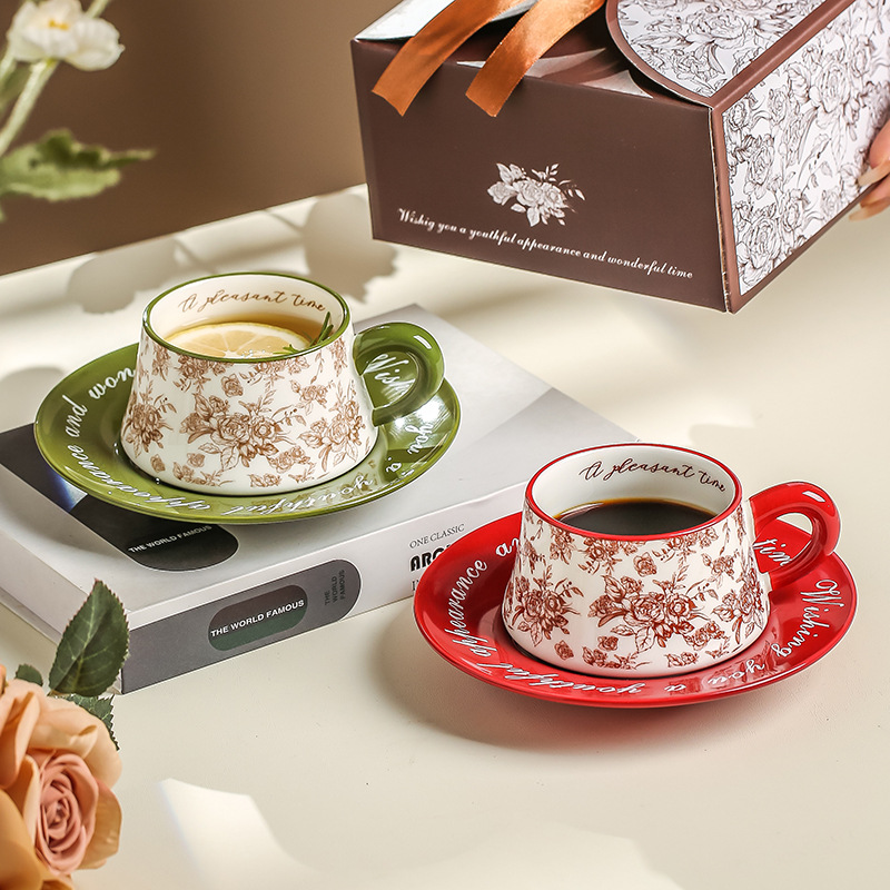 オリジナルのモリス風デザイン中国式赤いバラの花びら陶磁器コーヒーカップ皿女子プレゼントセットプレゼント