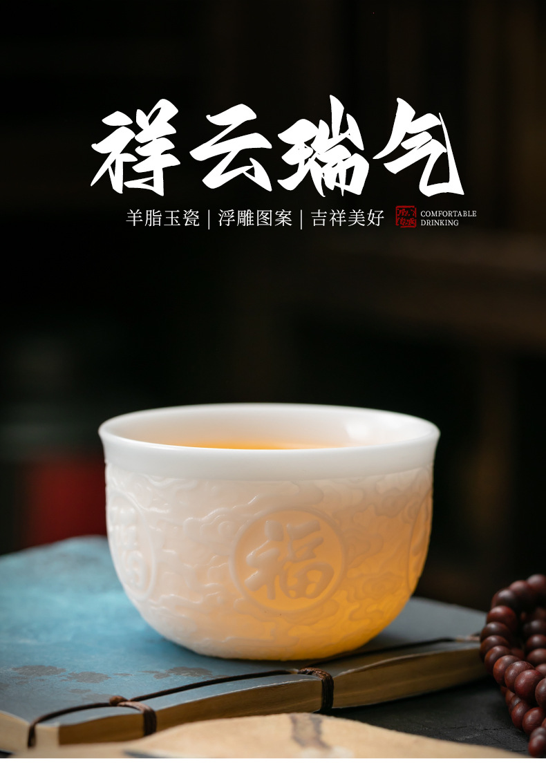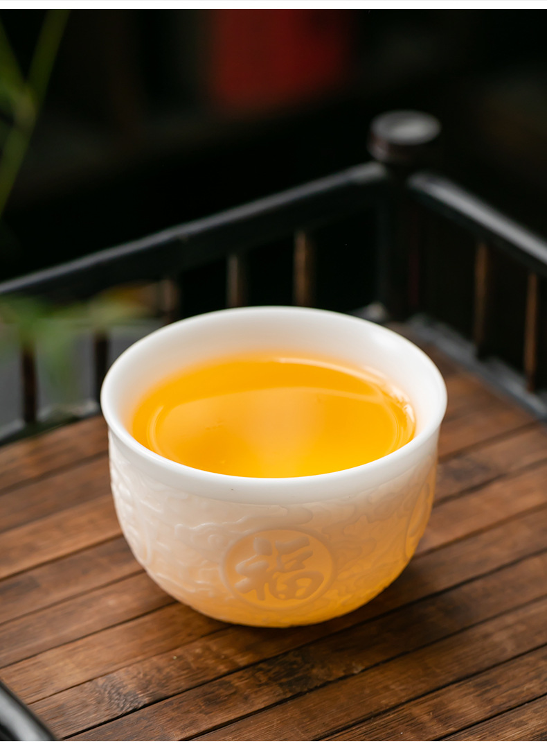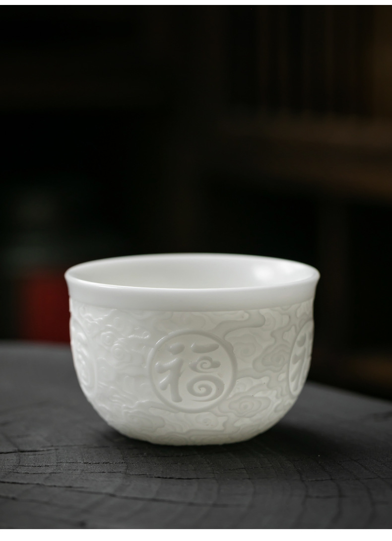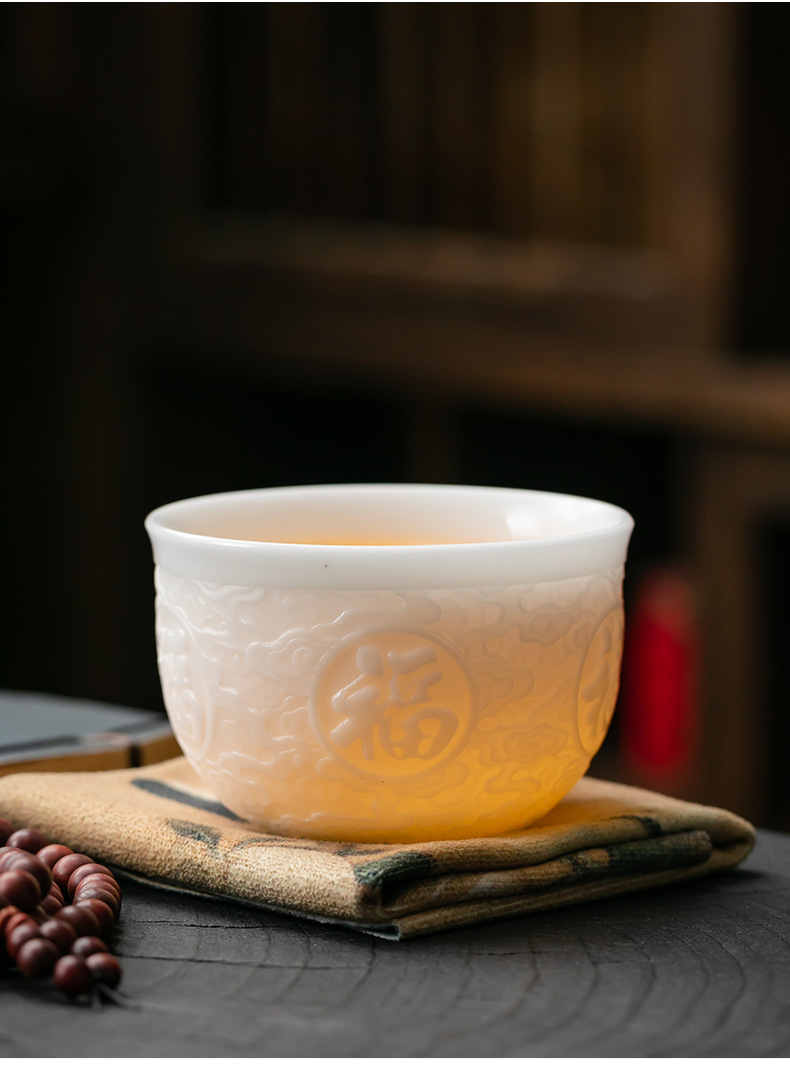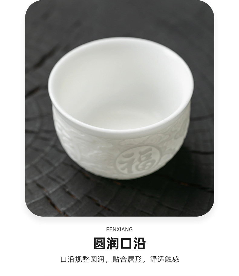 徳化手工羊脂玉浮彫り功夫茶杯、陶磁器製茶杯、功夫茶杯、家庭用香りを嗅ぐための茶杯